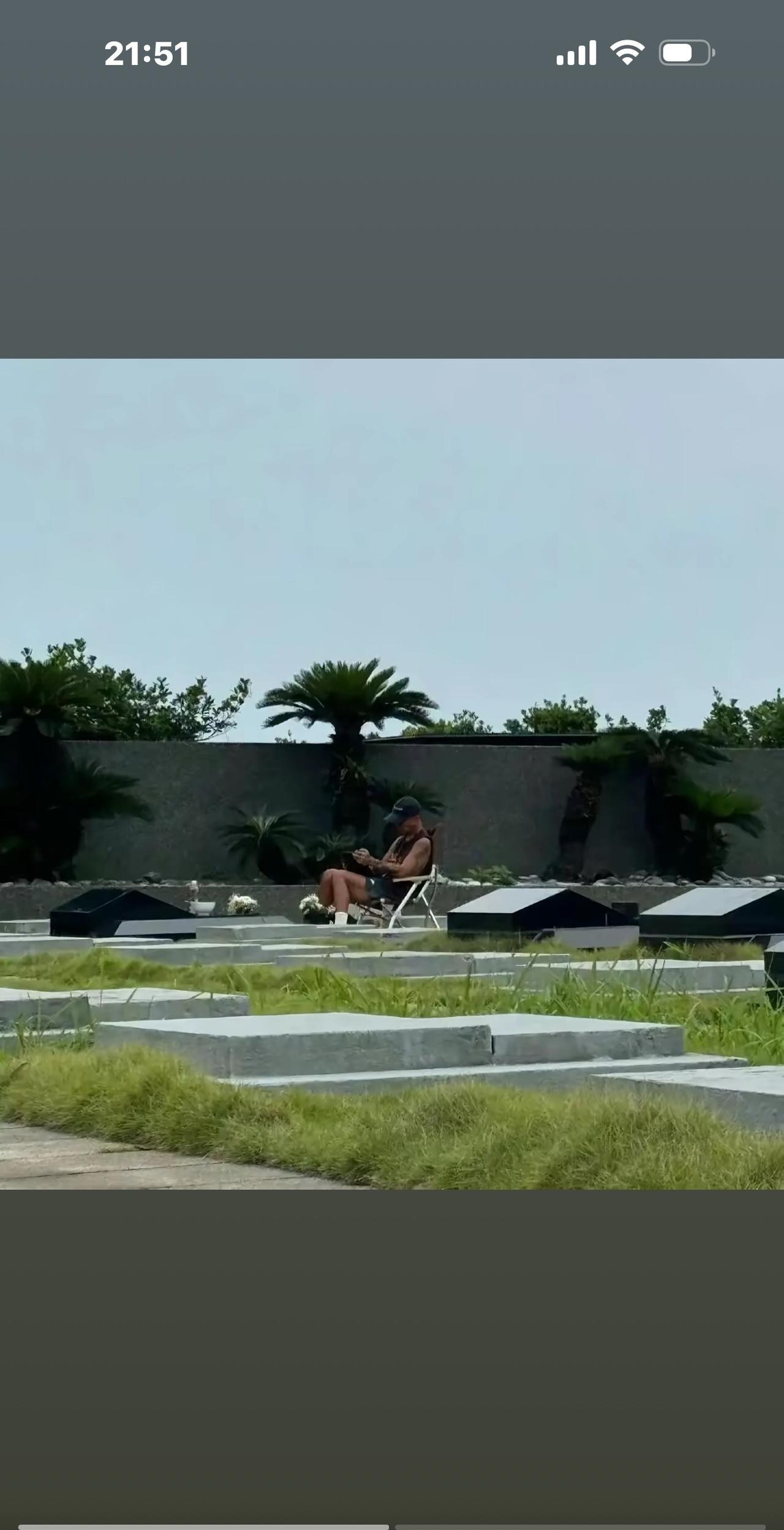 妈呀,具俊晔好深情呀,穿件老人背心,一条短裤,就跑去已故妻子大S坟墓前献花啦,那身上的纹身像一条大青蛇。 大家都知道,大S今年2月份去日本旅行,感染流感和肺炎意外去世,3月15日,骨灰葬在台湾新北市金宝山的“玫瑰园”,入土为安,至今已5个月了。 没想到的是,大S去世后,具俊晔并没有像许多网友预想的离开台湾,回韩国发展,他还继续呆在宝岛“混生活”。 以前,大S在时,具俊晔以“新晋艺术家”身份留台发展,办画展、设计衣服、做音乐等等,可以说,和大S结婚开启了他事业的第二春。而随着大S去世,他还继续在台湾站稳了脚跟,说明他还是有些能力的。 更让人想不到的是,工作之余,他还常常跑到大S坟墓前献花、悼念、沉思,仿佛她还在身边一样。 瞧,第一张照片里,具俊晔穿着一件老人灰背心、一条藏蓝色短裤,戴着黑框眼镜,胳膊和腿上全是黑色的纹身,像一条大青蛇,他正低头,在大S坟墓前献花呢。 旁边有一个黑色背包随意放在地上,后面是一张休闲椅,一件浅蓝色衬衣还搭在上面,这些应该都是他的所有物吧。 由于晒得黑黑的,具俊晔看起来有点苍老,真的像个小老头了,不过他也50多岁了,不再年轻,人生已过大半,对生命的领悟或许也会更透彻,对珍贵的感情,对逝去的爱人也倍感珍惜吧。 另一张照片里,天色已黄昏,具俊晔坐在那张休闲椅上,气定神闲,看起来不急不乱,享受着此刻当下。 他还是穿着短裤背心,不过是不一样的颜色,显然是另一天拍的,他还戴了一顶黑色的棒球帽,正在大S坟墓前刷手机呢,他是在翻看妻的照片吗?还是随意在网上冲浪,陪伴在一旁的妻呢? 半年不到,大S的坟墓前已经青草萋萋了,不知名的小花怒放着生命,时间过得真快呀! [蜡烛][蜡烛]