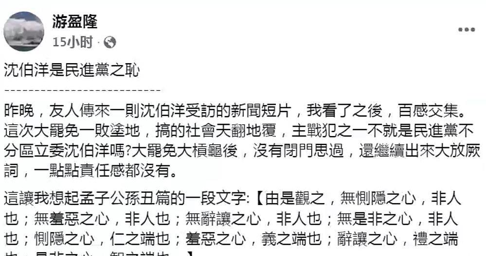 何止是“民进党之耻”,沈伯洋是“反中”急先锋,“台独”分子,更是“中国人之耻”。立场偏绿的台湾民意基金会董事长游盈隆重批民进党籍“立委”沈伯洋“是民进党之耻”,林浊水也附和点名沈伯洋“极端”,引发关注。