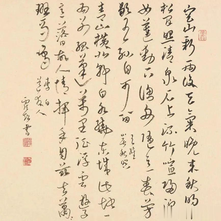 草书则上溯明初宋克章草,下接唐代草法,小字雅致如幽兰吐芳,大字威武似金刚怒目,将"以法为结构,以情为本质"的草书精髓发挥得淋漓尽致。