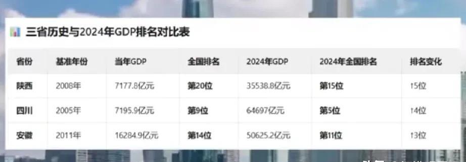西安,合肥,成都有没有带动母省陕西,安徽,四川的发展? 强省会战略一直都是民间争议巨大的话题,省会城市起来了,全省饿瘦了,这种观点一直存在于网络里。 看看西安,合肥,成都3个强省会城市发展起来了,母省陕西,安徽,四川有没有跟着进步? 1.西安2008年开始实施强省会,西安从2008年的全国第30名,gdp3241亿,提升到2024年全国第21名,gdp1.33万亿。 陕西省从2008年的全国20名,提升到2024年全国第15名。 2.合肥2011年开始实施强省会,合肥从2011年的第38名,gdp2702亿,提前到2024年全国第19名,gdp1.38万亿 安徽省从2011年的全国14名,提升到2024的全国第11名。 3.成都2005年实施强省会,成都从2005年的第14名,gdp2371亿元,提前到2024年全国第7名,gdp2.2万亿 四川省从2005年全国第9名,提升到2024年全国第5名。 综合数据,西安,合肥,成都3市排名上升,母省陕西,安徽,四川排名也随之上升,有效果的。#合肥现状# #合肥GDP# #合肥城市竞争力# #成都发展战略# #合肥发展规划# #合肥现状#