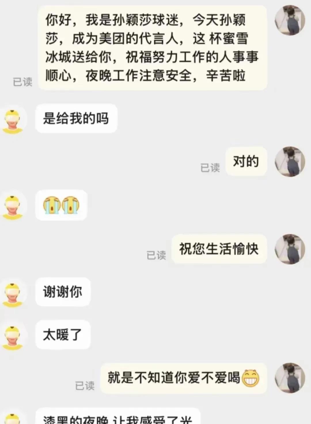 美团这两天单量暴增,来自球迷的爱,不少球迷为外卖小哥送清凉。 “我是孙颖莎的球迷,今天是孙颖莎成为美团代言人的第一天,这杯奶茶送给您,天气炎热,这么晚还在为了生活奔波,辛苦了!”