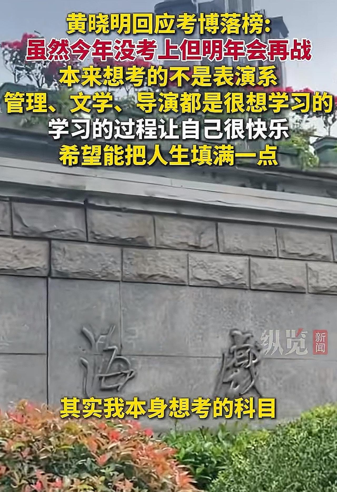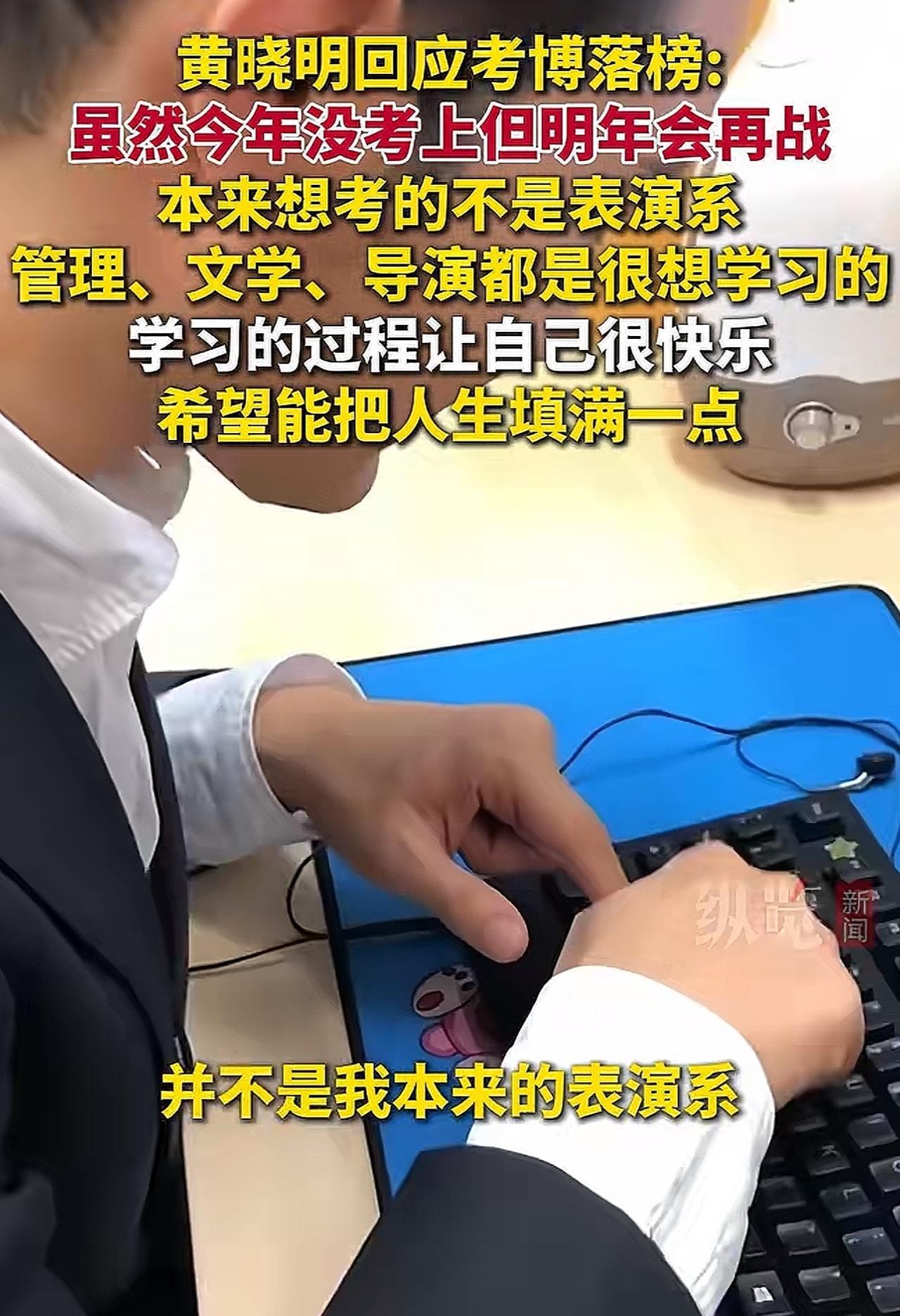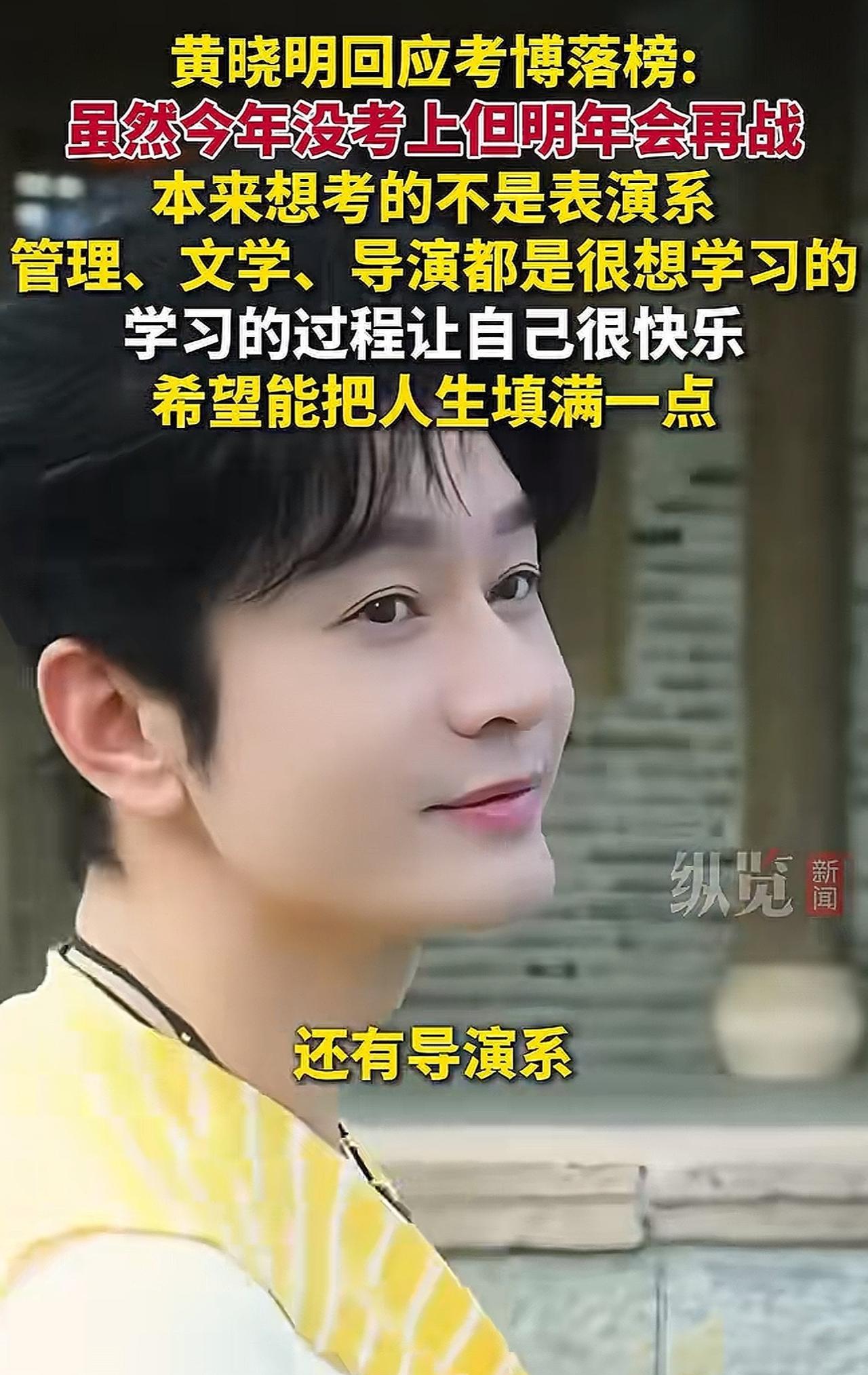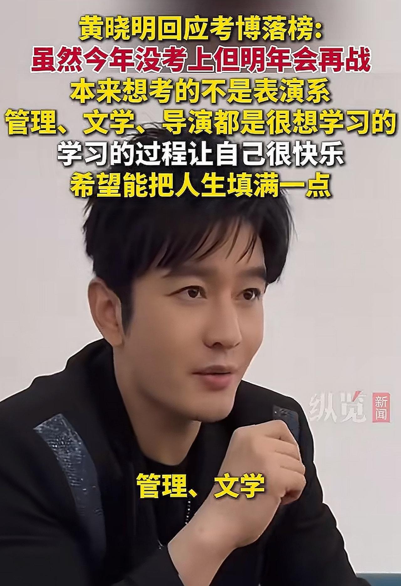 #MCN双量进阶计划#“确定明年再战!”近日,黄晓明接受采访再度回应考博落榜,他说:“很可惜今年没考上,但是明年会再战,本来想考的不是表演系,管理、文学、导演都是很想学习的,不管学的知识用不用得上,但学习的过程让自己很快乐,希望能把人生填满一点。” 对于黄晓明的回应,网友们各有不同的看法。有网友调侃道,“晓明哥没考上的原因,不会因为是打字太慢了吧?” 还有网友则指出,“博士是做啥的小明哥都不知道,读博不是学习,而是在现有的知识体系上做突破和添砖加瓦才能获得博士学位!” 黄晓明考博落榜后那句“明年再战”,周少不得不说真挺让人感慨的。47岁的他,在演艺事业已取得诸多成就,本可安稳享受成果,没选择“躺平”,而是挑战考博提升自己,这股子上进心就很难得。 他想学习管理、文学、导演,并非盲目跟风。这些年他涉足影视项目幕后工作,参与筹备、运营,对管理知识有切实需求。 从台前走到幕后,他可能越发觉得多领域知识对自己的重要性。而且他还说学习过程让自己快乐,想把人生填满,这种对知识纯粹的追求,值得肯定。 除此之外,网友的调侃和质疑,也能理解。“打字慢”虽是玩笑话,却也反映出大众对明星学术能力的好奇;质疑他对博士的理解,也体现大家对学术严肃性的维护。 可能很多人还不知道,实际上,黄晓明报考录取率不足10%的专业,还为备考推掉两部戏,足见诚意,也并非嘴上说说而已。 但不管怎样,周少觉得黄晓明没被这些声音影响,直面落榜,选择再来,这种不逃避、不服输的态度,值得点赞。他用行动诠释了终身学习的理念,也给娱乐圈后辈做了榜样, 对此,大家觉得黄晓明明年能考上吗?#寻美三湘# #长沙新朋友#