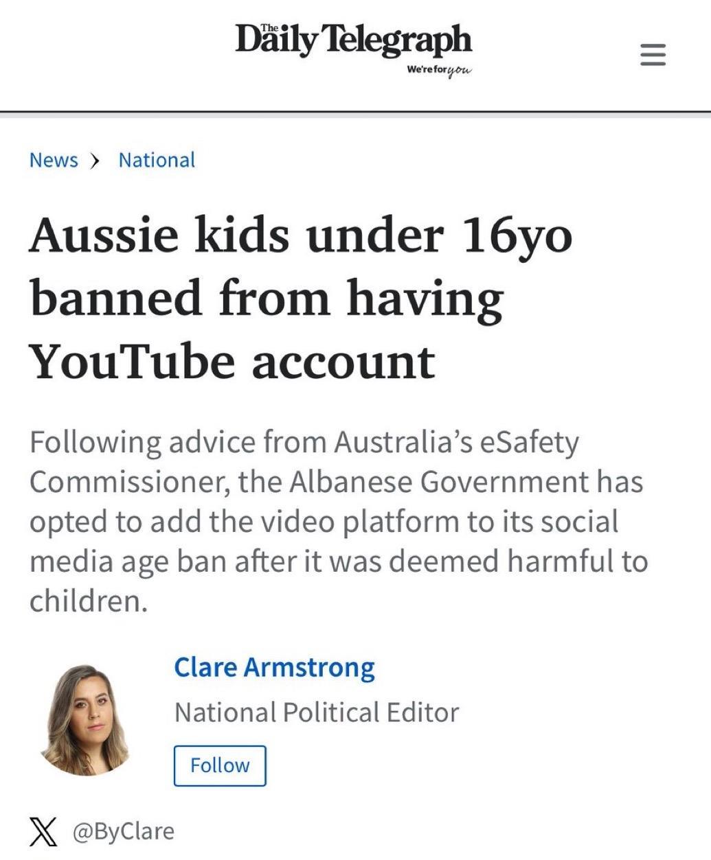 澳大利亚阿尔巴尼斯政府禁止 16 岁以下儿童使用 YouTube。