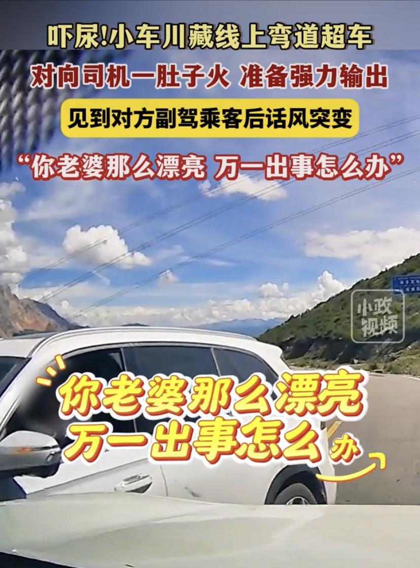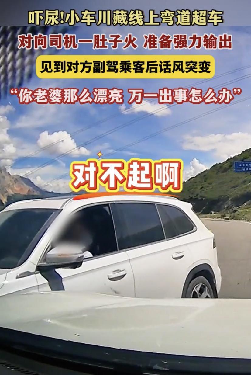 西藏,男子开车在川藏线遇到小车逆行弯道超车,男子一肚子怒火,刚要找对方理论,却突然发现对方车子上坐在副驾驶的女士相当漂亮,瞬间变脸:你老婆这么漂亮,万一出事了怎么办!网友:我倒想看看到底有多漂亮 行车记录仪显示,当时男子正常行驶,前方对向一辆白色小车想要弯道超车,结果两车差点撞到,男子在车里当场就大骂对方,但两人并排时,男子还准备训斥对方一下,可对方却把车窗摇下来连声道歉,说着对不起 男子本来一肚子火,结果看到对方的态度,也是不好输出,刚好看到副驾驶坐着对方的老婆,于是改口称“你老婆那么漂亮,万一出事了怎么办” 不过事后,他一想也觉得有些不好意思,只是当时脑子没转过来,随口就说出去了 其实想一下,开车遇到危险操作,像这种弯道逆行超车,换个人早就下车撕了。可对方车主当场摇窗、连声道歉,那种“我错了我真的错了”的态度,说实话,比你强词夺理来气多了。正因为他第一时间就示弱认错,把主动权交了出去,才让对方那口恶气没法顺势爆发 从驾驶行为来说,对方确实有错,这种危险超车一点不该被原谅,但现实中,道歉的态度往往比你讲多少道理都管用。很多时候,路怒不是因为事儿多大,而是因为对方那个态度让人气不打一处来 你只要敢摆出一副“我就这样你能咋地”的架势,对面十有八九直接开干。可一旦态度诚恳,说几句“对不起,我冲动了”,情绪立马软下去 生活中有时候没有那么多的矛盾,双方各让一步,往往就能够海阔天空