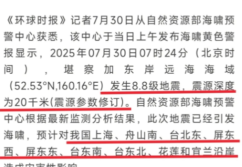 俄罗斯远东发生8.8级地震,俄核潜艇基地恐受影响;日本17个地区发布海啸预警,中国上海可能也要受灾