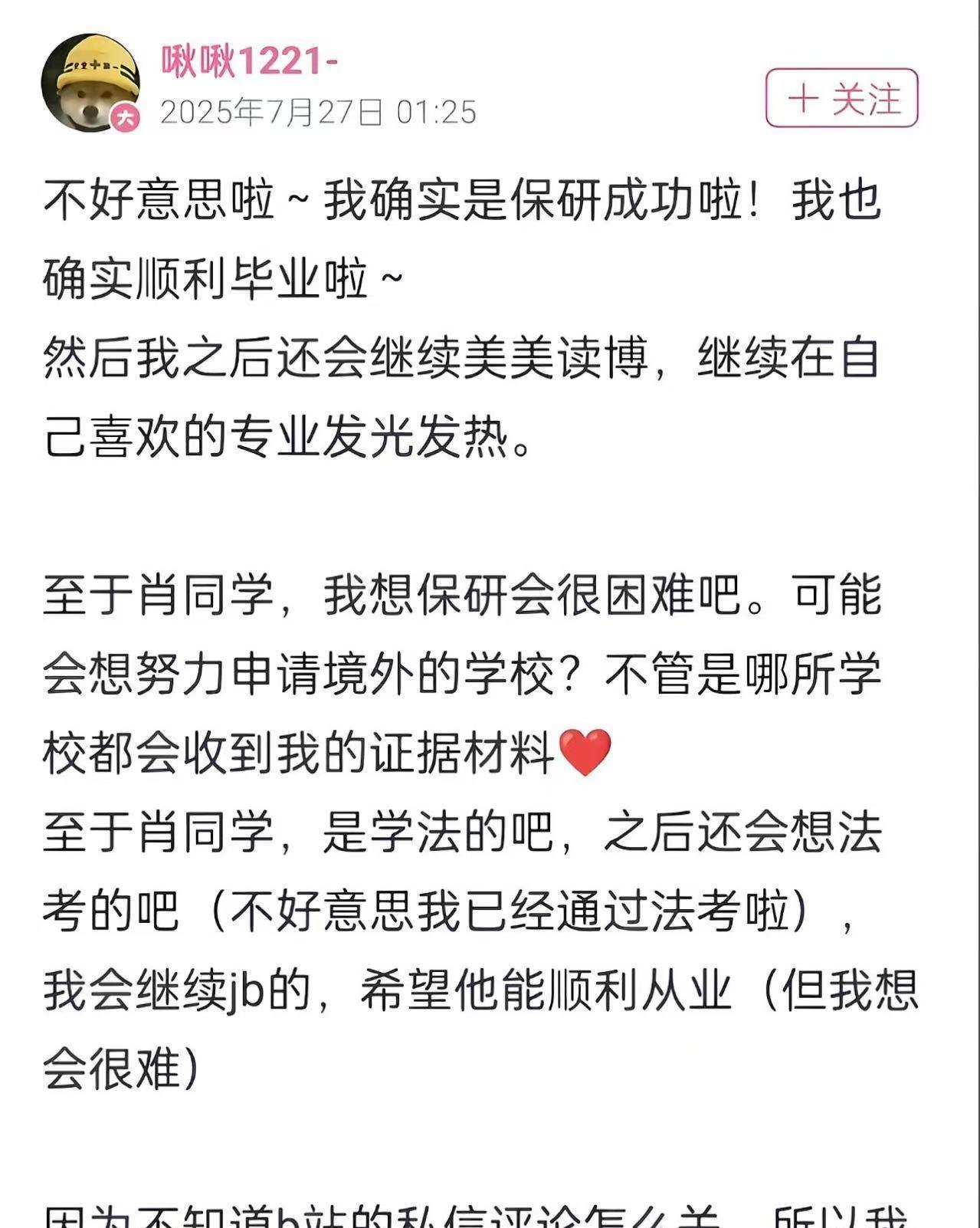 为啥大家对武大硕士杨景媛如此痛恨?因为这类女性有着极为鲜明且令人厌恶的共性。7月25日法院一审判决认定,肖某某因特应性皮炎发作而做出抓挠动作,并非性骚扰行为,驳回杨景媛全部诉讼请求后,杨景媛不仅拒不道歉,坚称自己没错,还高调炫耀自己 “保研成功”“继续读博”,甚至威胁要向肖某某申请的所有院校投递 “举报材料”,试图继续迫害这个已然遭受巨大创伤的无辜男生。 和翟欣欣(敲诈勒索前夫致死)、燕冬萍(离婚案)、张薇(广州地铁偷拍)之类的人如出一辙,她们在行事风格上,往往步步紧逼,网曝开盒,丝毫不给他人留有余地; 在面对问题时,极为擅长黑白颠倒,将无理之事说得头头是道,不把人置于绝境绝不罢休;一旦与他人产生矛盾,没理也要辩三分,得理更是不饶人,在她们的认知里,自己永远不会犯错,错的永远是对方。 在此次事件中,即便法院已经做出公正判决,杨景媛依旧固执己见,对自己给肖某某及其家庭造成的巨大伤害毫无悔意,反而变本加厉地进行威胁。这种行为不仅扰乱了公共秩序,也侵犯了他人的合法权益,显得极为可恶,这类女性一旦步入婚姻,对于男方而言,极有可能成为一场灾难。 另外杨景媛是法学专业的硕士研究生,大家也担心这样一个道德有缺陷的人走向社会后,会让更多无辜的人遭受伤害,香港浸会大学录取其为博士生要慎重,应重新审视其入学资格。#武大性骚扰事件涉事女生在港读博##头号创作者激励计划#