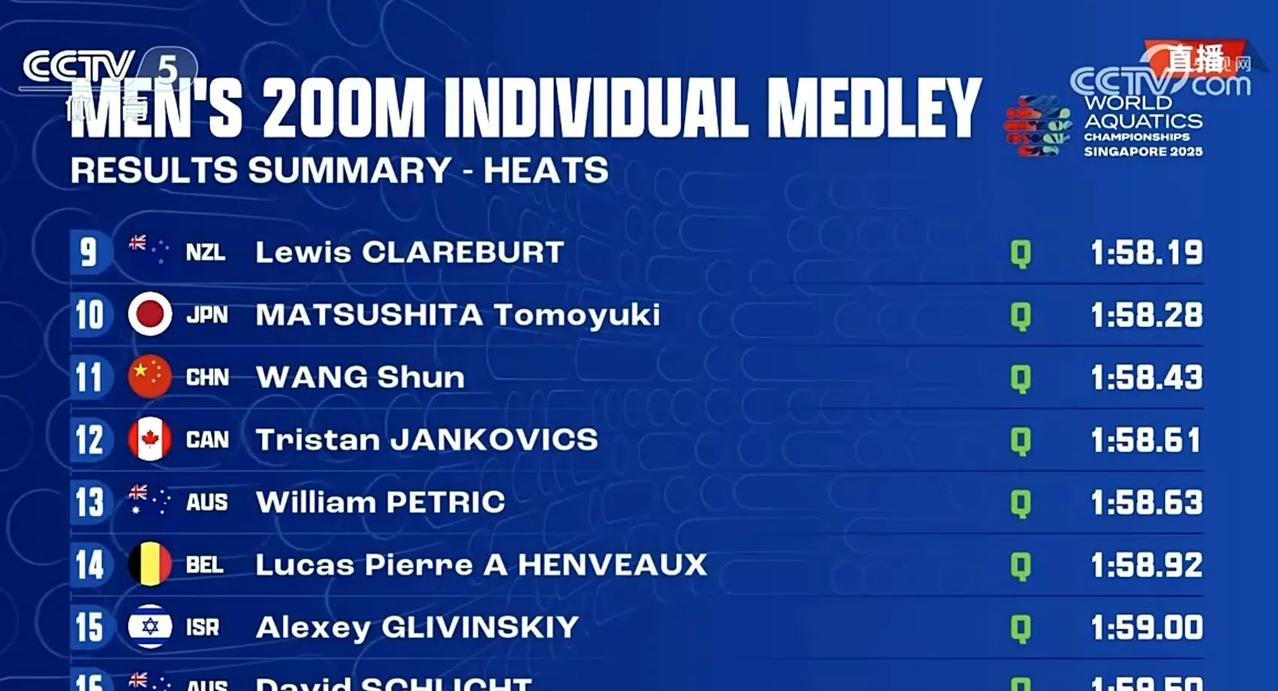 2025世界泳联新加坡世锦赛男子200米混合泳预赛中,中国队八朝元老汪顺游了1分58秒43,排名预赛第11位,晋级半决赛,这成绩符合小组赛水平,汪顺控分成功。 比赛中,央视解说好像看错人了,汪顺第六位的时候说他超到了第一位[捂脸]。 现场观众太令人感动了,汪顺仿佛主场作战,现场为汪顺加油的声音大得以为在国内比赛[笑哭]。 汪顺加油,争取夺牌[奋斗]!