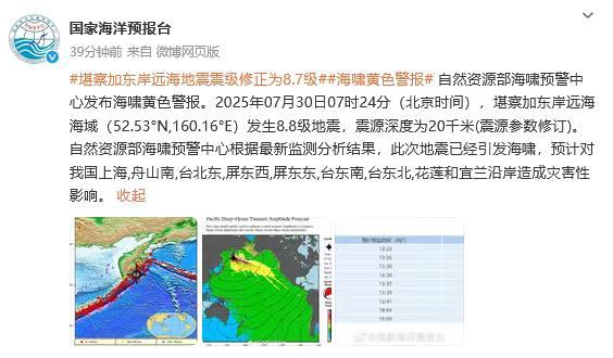 【#自然资源部发布海啸黄色警报#】#俄强震或对我国沿岸造成灾害性影响#自然资源