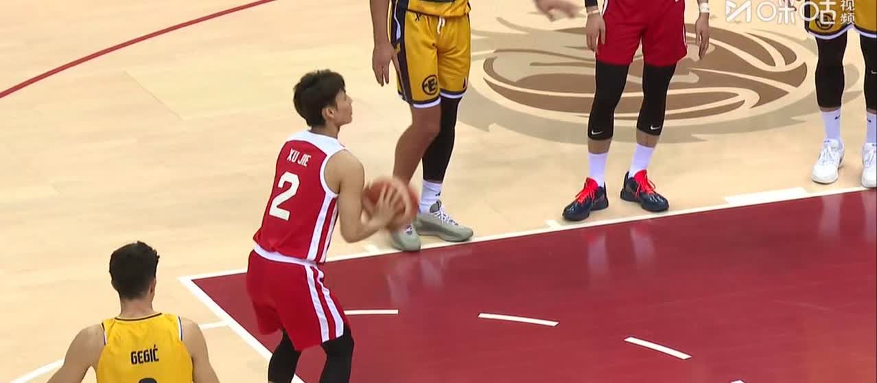 徐杰上场就投进三分,连得五分,可惜后面中国男篮连续失误,徐杰出手一个三分球不进就
