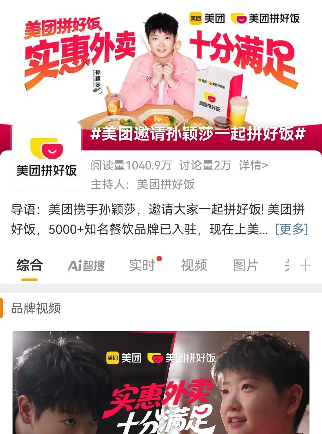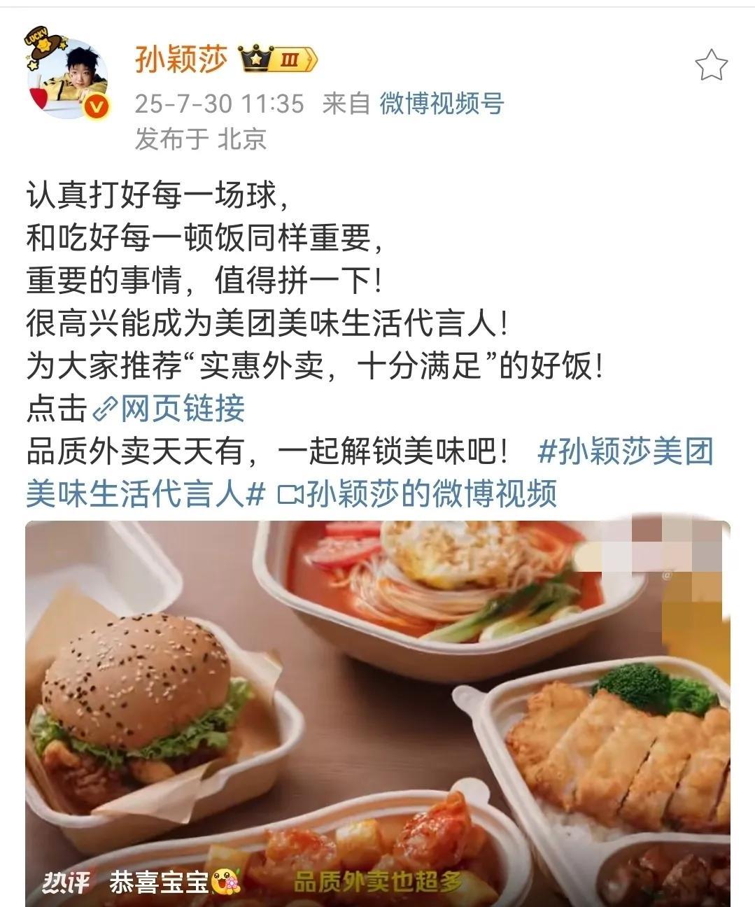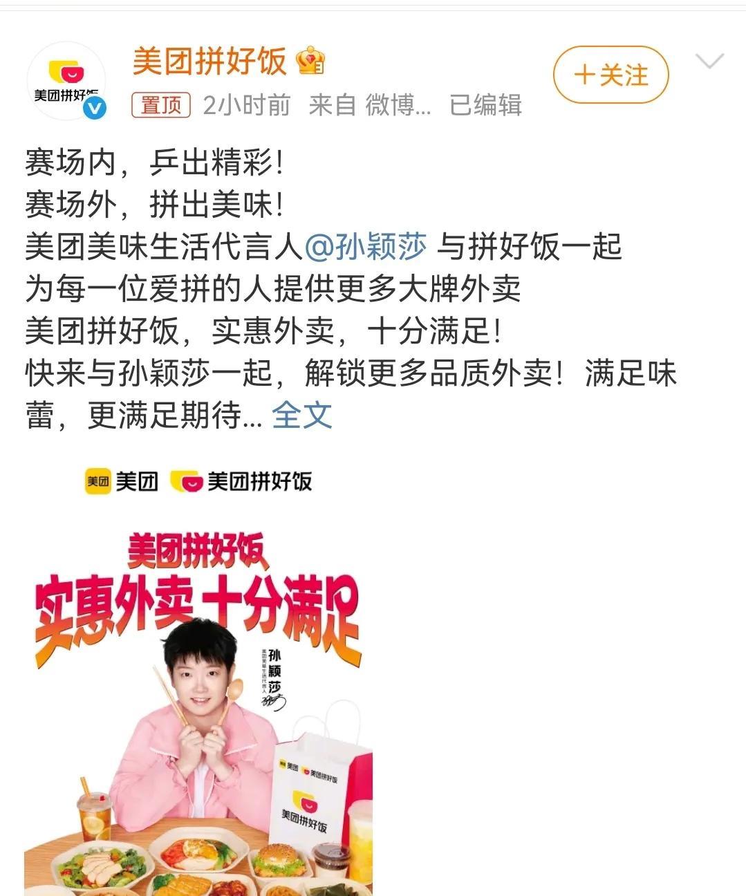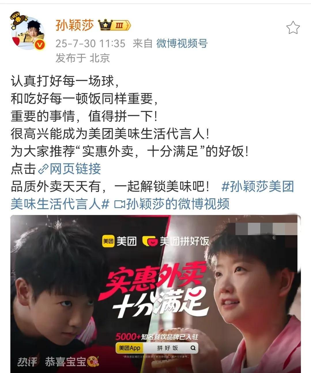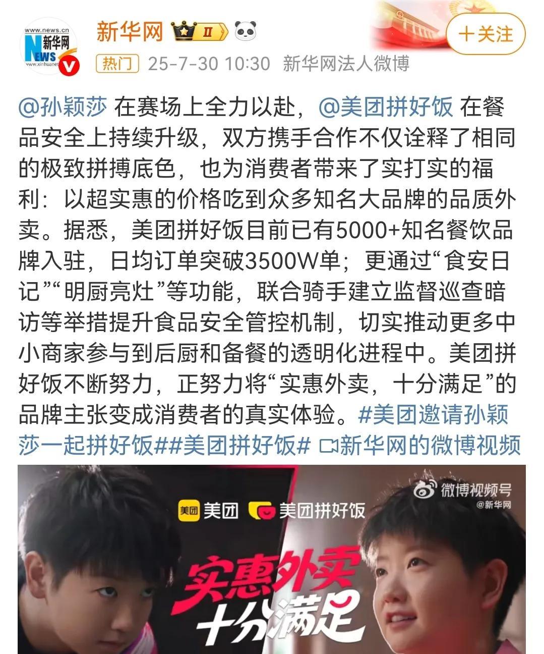 原来莎莎一个人从厦门提前回北京,是为了帮大家推荐实惠又好吃的外卖这事在忙碌,恭喜孙颖莎成为美团美味生活的代言人。 莎莎说: 认真打好每一场球 和吃好每一顿饭同样重要 重要的事情值得拼一下 很高兴能成为美团美味生活的代言人 为大家推荐:“实惠外卖,十分满足” 的好饭。 孙颖莎成为美团美味生活的代言人,连新华网都亲自下场打Call。孙颖莎在赛场上全力以赴,美团拼好饭在餐桌上安全升级,双方携手合作不仅诠释了相同的极致拼搏底色,也为消费者带来实打实的福利,以超实惠的价格吃到众多知名大品牌的品质外卖,有5000+知名餐饮品牌入驻,日均3500w单,更通过“食安日记”“名厨亮灶”等功能,联合骑手建立监督巡查暗访等举措提升食品安全管控机制。切实推动更多中小商家参与到后厨备餐透明化进程中,美团拼好饭不断努力,正努力将“实惠外卖,十分满足”的品牌主张变成消费者的真实体验。 连央妈都为孙颖莎的美团美味生活代言力挺,众口难调不是最大问题,食品安全监督和商家的自我监督才是最重要的一环,快速发展的社会,越来越多的人选择了更加方便快捷的外卖,期待有更多的良心商家加入美团拼好饭,也希望大家吃的健康,吃得快乐。 莎莎成为了美团美味生活的代言人,头哥哥会不会又要被京东相中呢!他俩的代言总是会配平的,期待头哥的下一个代言。 #晒图笔记大赛#