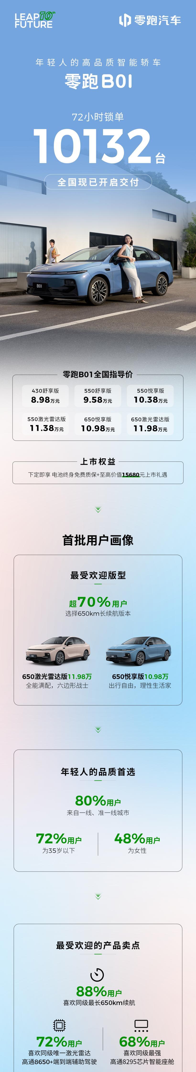销量、产能均破记录,零跑B01第一万台量产下线。 要说最近有什么热门新车,我首推零跑B01,因为它不仅72小时锁单10132台,更是在上市7天内,实现了第一万台量产下线。 有产能,也有定单,零跑B01注定是爆款,而且从锁单量与时间来看,这车比此前的零跑更畅销,为零跑开启了第二增长点。此前零跑已经实现月销超4.8万台,并蝉联3-6月份新势力销冠,B01的到来,也许能带动零跑月销破5万,再度获得新势力销冠。 从产品端来看,零跑B01也确实值得大家的选择。售价11.98万的零跑B01,对比小鹏MONA M03等同级竞品车型,也就只是入门款的价格,但产品力体验可是顶配水平,比如续航直接给到了650km+18分钟快充,无论是市区通勤还是长途出游,它都能轻松胜任;智能化部分也同样是大满屏,不仅带有高通8295座舱,还配备了同级少见的激光雷达+端到端组合辅助驾驶系统。 简单来讲,零跑B01以入门的价格,做到了同级顶配的用车体验,综合来看,相当划算,有需求的可以去试一试。 #零跑汽车##零跑b01##零跑B01正式上市售8.98万起#