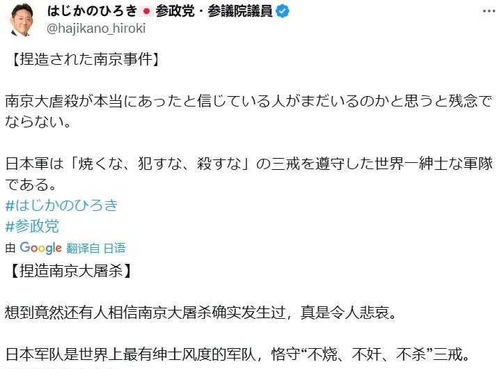 “日本军队是世界上最有绅士风度的军队,恪守…“不烧、不杀、不奸”三戒!” 这是电影《南京照相馆》上映后,日本参议员初鹿野裕树的贴文内容! 不光是他,很多日本网民也一样,又一次好似被踩到麻筋般,集体跳了出来! 方向很集中,就是否认南京大屠杀,否认当年日本侵略军的暴行! 看到这种情况,我们国内有些人还要纠结要不要铭记历史么?还要一味放下,“一衣带水”么? 真那样的话,80年前的历史就会在这些人的“绥靖”下,被篡改,被抹除!甚至还要被他们倒打一耙!不要质疑,从他们纪念广岛,长崎原子弹爆炸的力度和方式看,端倪已现! “抢光,杀光,烧光”这臭名昭著的“三光政策”,他们是没有记忆的,不但没有记忆,像上面那个参议员般,甚至要标榜自己是“三不”军队!哦,严格意义上,日本是没有军队的,因为它不配拥有军队,这一点,要明确! 所以啊,像《南京照相馆》这样的电影,要多拍,多宣传,宣传到国际上去!你不是要否认么?你不是要搞历史修正主义么?那就当面锣对面鼓,让史实永不蒙尘! 历史,绝不容篡改,更不容背叛!我们要把日军侵华暴行这块石头,永远压在大和民族的脊梁上。这,是它们应得的!这,是它们要付出的民族代价! 我们光明正大!我们善恶分明!