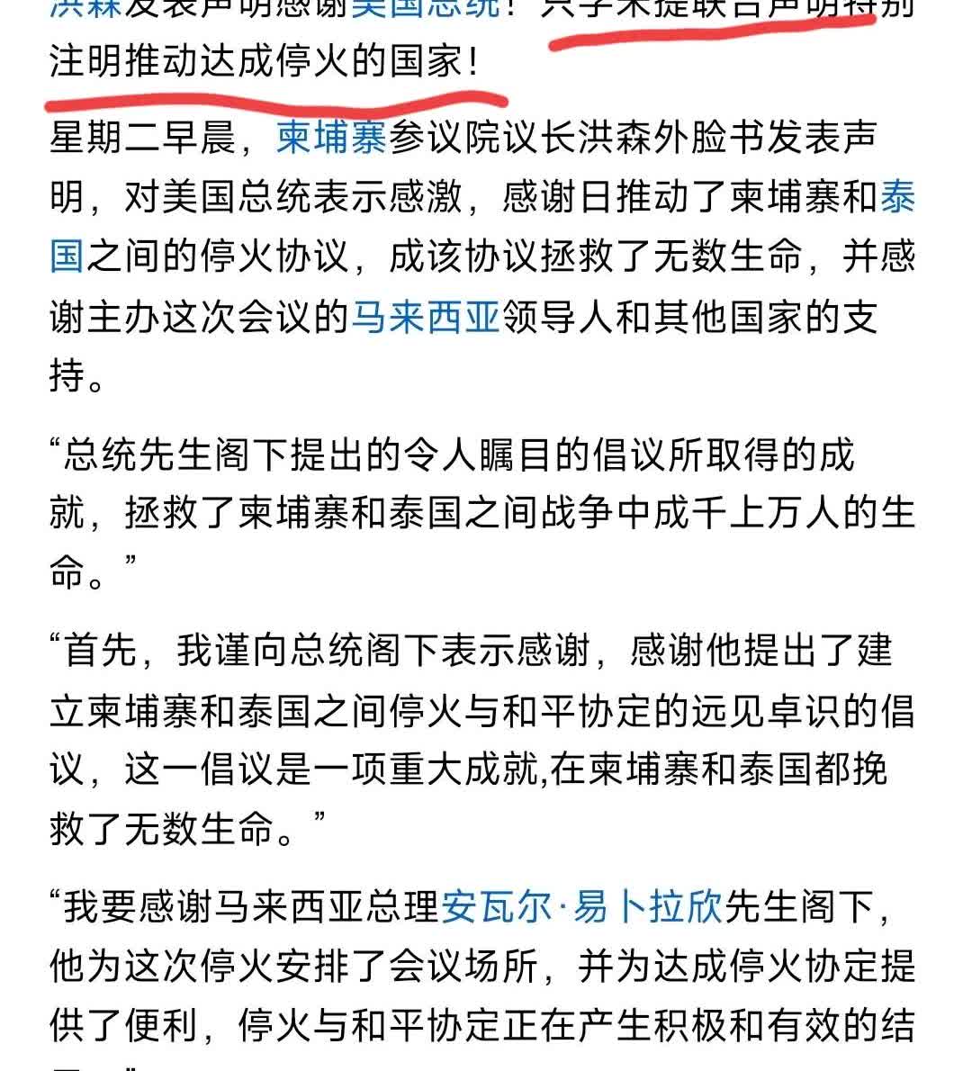 洪森谢了一大帮人,却故意不点中国! 泰国柬埔寨停火,当晚洪森连发两条推文。 头一条,晒跟特朗普的旧合影,还喊着“感谢老朋友”。 紧接着,在感谢支持停火方声明里,对特朗普极尽吹捧,接着是马来西亚,最后是“其他”……提都没提中国! 面对赤裸裸挑衅,咱们可不能太仁慈了,以德报怨,换不来尊重。 网友表示:从洪森让他儿子去老美西点军校上学开始,到他们单方面要更改大运河合同,邀请日本船舰到访具有重要战略意义的柬港口,很明显,这个曾经被我们拯救过的小弟,准备投向我们的敌对阵营了。 用不着提,中国也没打算使劲,后面还得找机会收拾他呢! 意料之中,洪马奶西点军校毕业。不少黑料在美国。洪森以后只能舔美。 中国不指望他的感谢,只是希望他及他的国家,以后不要哭诉着求中国给予这样或那样的帮助。 这种人下场会很惨的,不用理他你就让他去蹦跶吧! 诈骗犯父子终将下台。事态还没完。收拾它们还在后面。 星辰大海的维度,岂是三叶虫等物种能知晓的。!不削与之。 不知道特朗普有没有给洪森打电话,通话的时候有没有录音