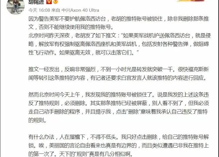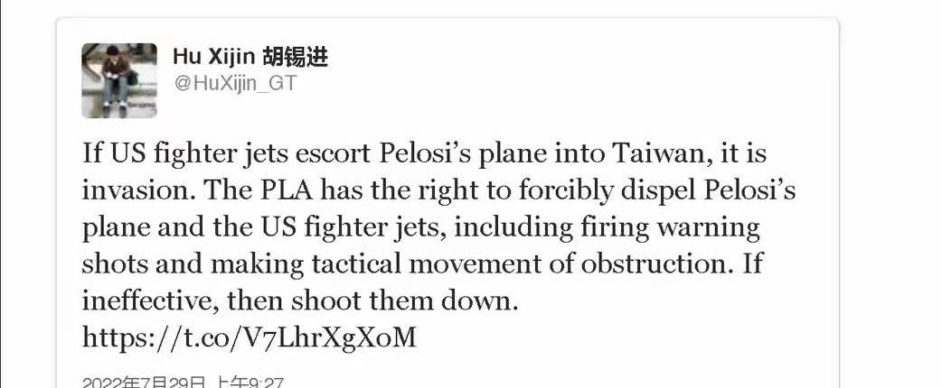 佩洛西今天(7月29日)了解到特朗普拒绝赖清德过境窜访纽约的消息后写道:“唐纳德.特朗普决定拒绝赖清德访问纽约,这发出了一个危险的信号:美国可能会在北京胁迫下对台湾问题保持沉默。这是中国的胜利,但愿这并不预示着美国政策的危险变化。” 2022年8月2日,时任美国众议院议长的佩洛西不顾中方强烈反对,乘坐波音C-40C运输机从马来西亚起飞窜访我国台湾,照片是她在马来西亚接受采访时所拍(图1。佩洛西真可谓是一个地地道道的反华急先锋,至今她仍在大放厥词,继续操弄台湾议题。当时还在《环球时报》总编辑任上的老胡,在推特(X)上发文主张(图4):一是迫降佩老妖乘坐的飞机,二是进行驱离,如果驱离无效,就可以击落它们。曾在国内引起轰动,上亿人观看直播。