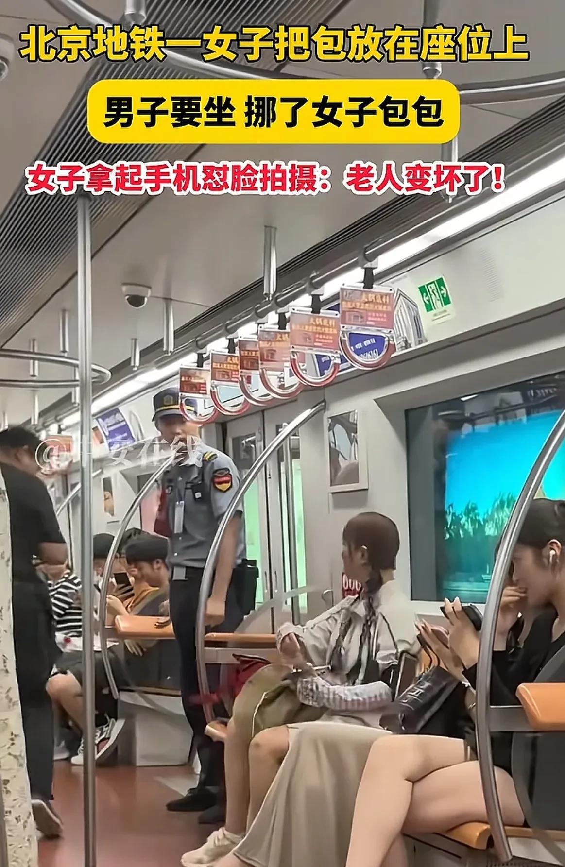 女子感叹老人变坏了,她放在地铁座椅上的包被老人“摸”了,老人在工作人员劝说下离座而去 这个女子坐地铁一个人占两个座椅,她口中的老人,将她包从座椅上挪过去,女子就拿手机对着老人录视频,质问为什么要摸她的包,并且喊道,快看老人变坏了,坏人变老了。 老人阻止女子录视频,女子又质问对方为什么拍她手机,男的忍无可忍问她是不是想打架? 地铁工作人员发现争吵及时出现,老人在工作人员劝说下,离开座位。 该女子的平台个人账号被网友找到,很多人去留言网暴女子,女子只能设置成私密账号。 这个女的她可能觉得地铁座位是她先来的,哪怕是放包,也代表有人坐,所以在包被人挪开后,她想录视频,把老人的“恶行”在网上公布出来。 结果没想到,网友并不是是非不分的,有人也把女子的行为发到网上,女子错误行为自然让其付出了代价。