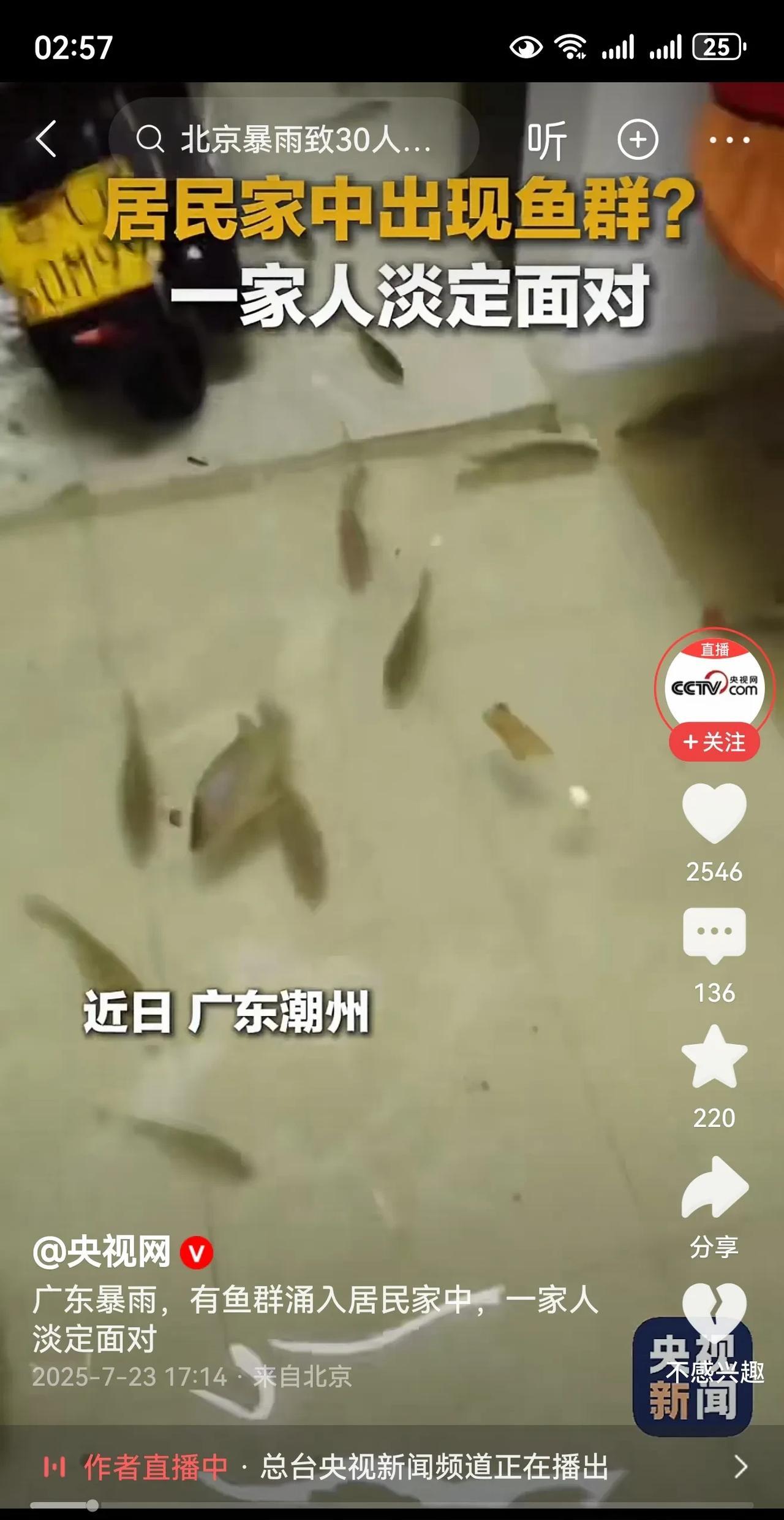 暴雨季,让人欢喜让人忧。广东潮州暴雨后,涌入1楼室内的不仅有雨水竟然还有鱼群,你