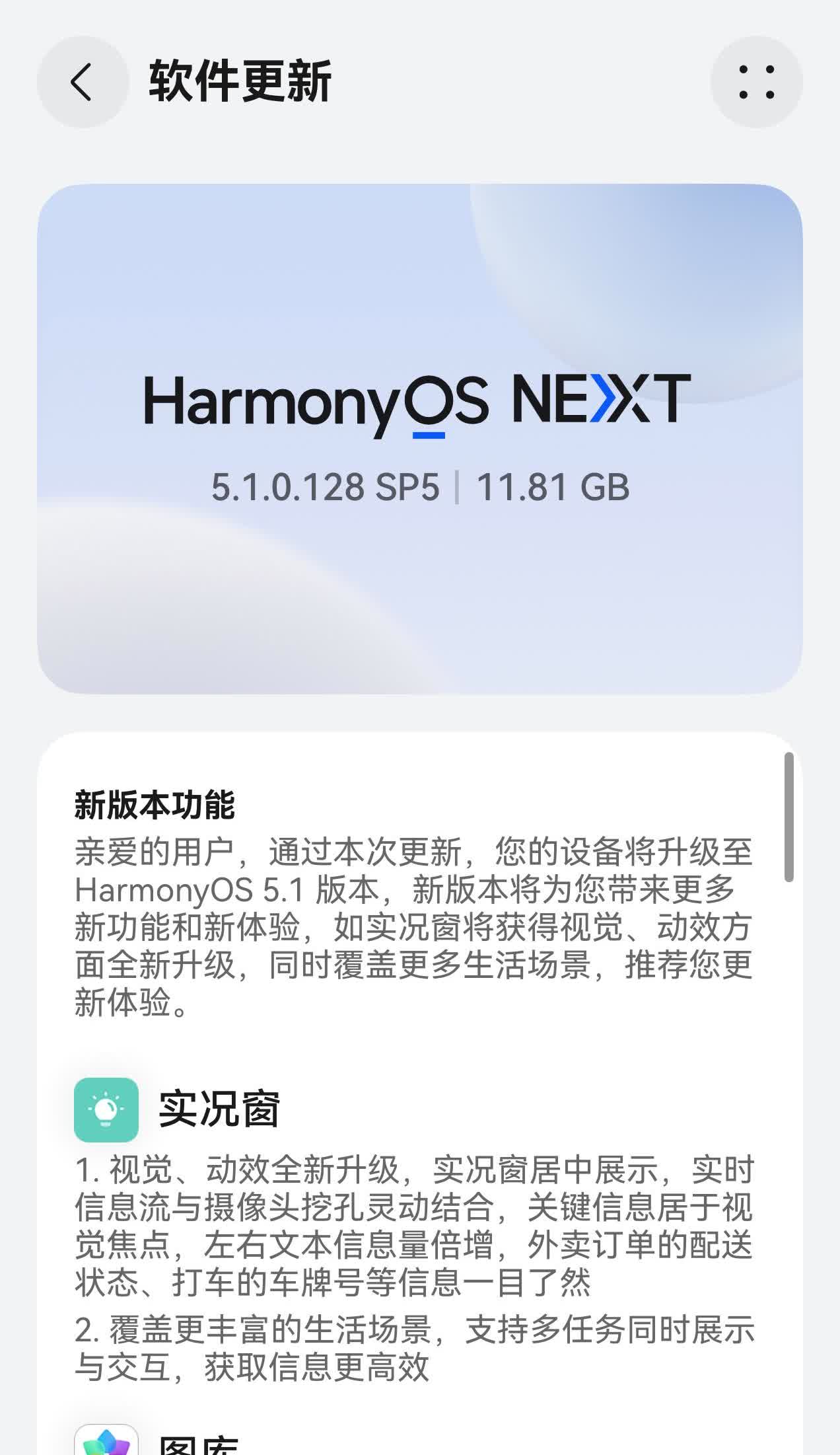 华为 nova 14 Ultra提前收到大版本更新通知,11.81GB大升级包。包括实况窗,图库,相机,主题,小艺,系统底层等多项优化。作为主力机已使用3个月,鸿蒙5.0越来越好用了。