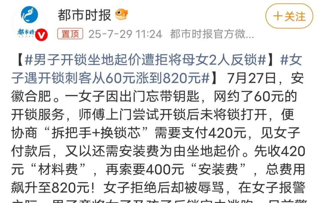 男子开锁坐地起价,从60元涨到820元,女子拒绝后将母女2人反锁。 安徽