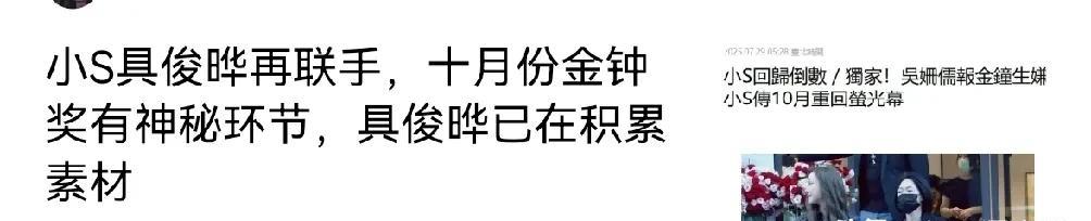 原来如此!具俊晔那么久没有消息,突然一下子出来那么多人偶遇,原来台媒报,小S有望十月份复出,10月份举办金钟奖还安排缅怀大S环节,小参加活动顺势复出,那么自己少不了具俊晔,具俊晔就还得再继续演深情呀,到时候不知道小S会和姐夫有什么梦幻联动,也是非常期待的,毕竟她家只要热度,其他无所谓! 讲真,大S也是可怜人,活着的时候家事被妹妹调侃,光头也成了妹妹表演的工具,人不在了还要榨干她最后的价值,终于明白为啥张兰说一家都在吸她的血……