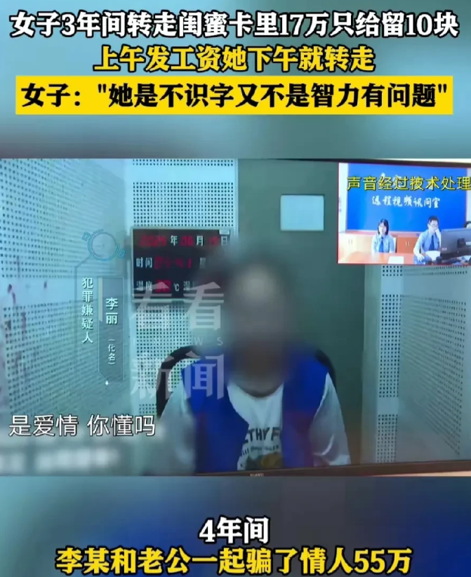 上海嘉定,女子月薪5000多,平时也不怎么花钱,结果却突然没钱交房租,卡上只剩下10元的余额。经过调查,原来闺蜜三年时间里悄悄转走她的17万工资。更为夸张的是,闺蜜明明已经是两个孩子的妈,竟谎称单身,和一男子陷入爱情,还大言不惭的表示:因为爱情!