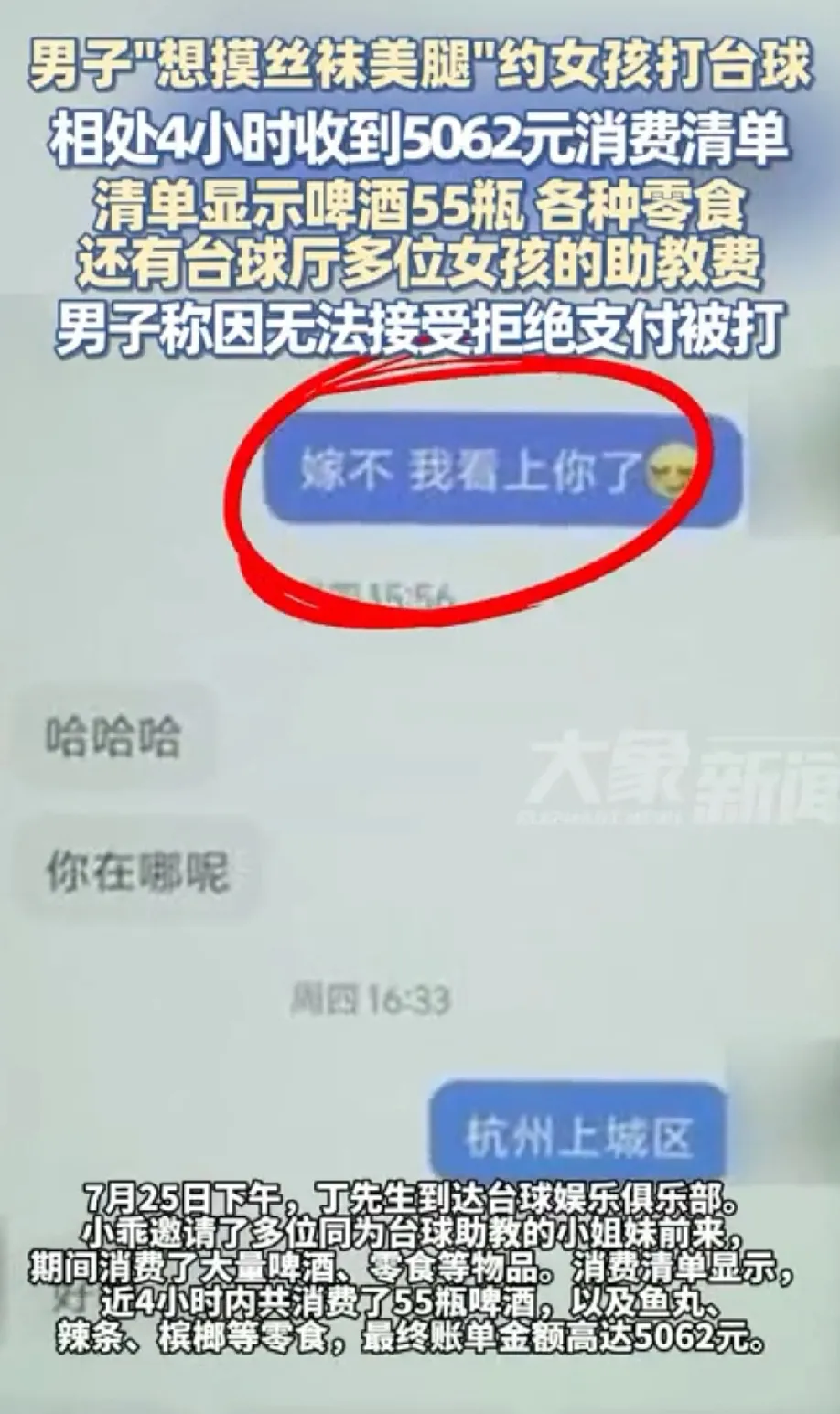浙江杭州,男子故意挑逗女网友说想摸她的丝袜美腿,还说看上女子了。女子没有拒绝,约男子在她上班的台球厅见面。男子屁颠屁颠的前往,4个小时消费5062元。付款时,男子觉得被台球厅套路了,拒绝付款,结果被人一顿殴打。男子索赔医药费,店长表示,男子像选妃一样,消费完了还不想付款。