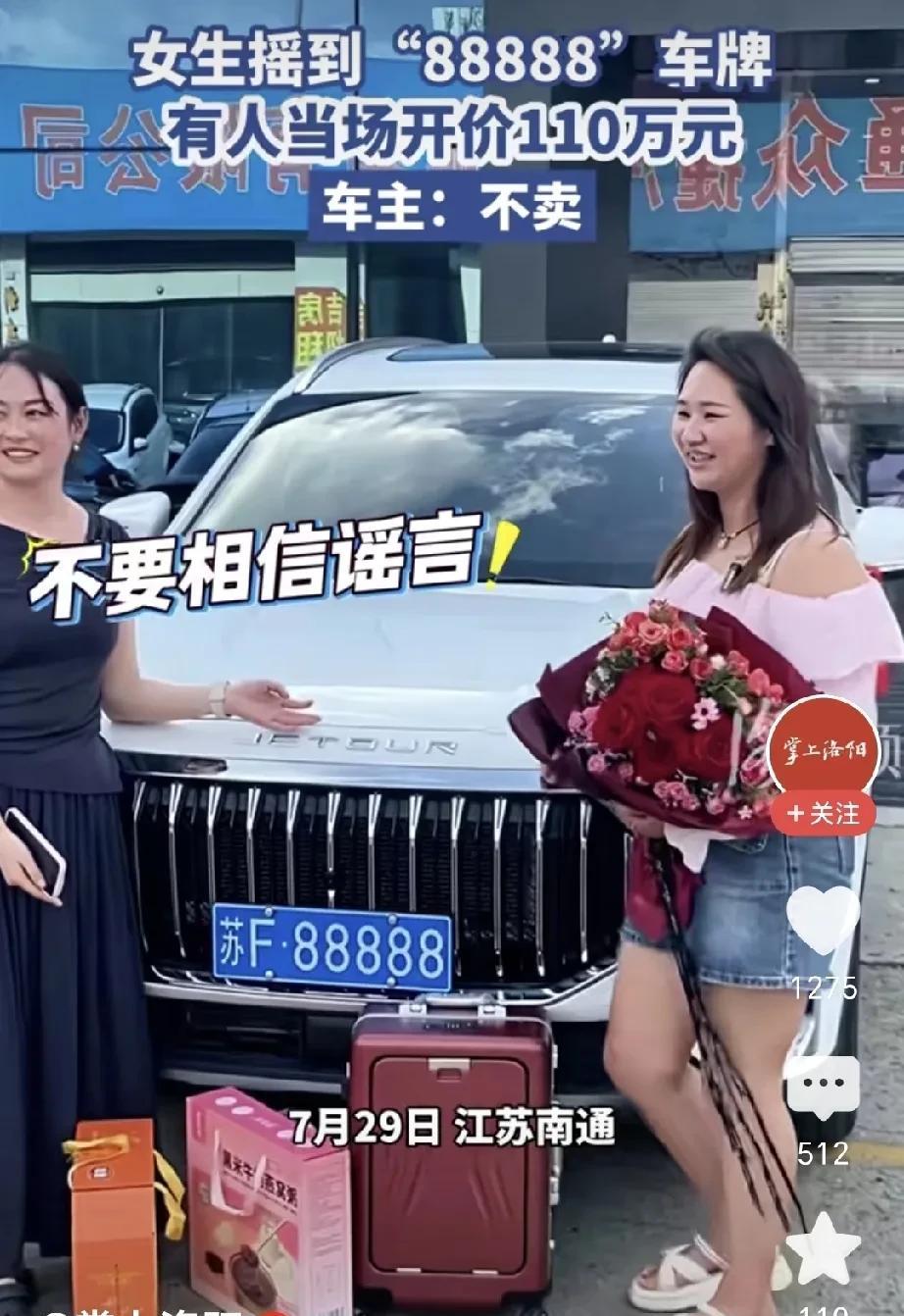 女子车管所摇号摇到5个8,有人当场开价110万,我认为这不是真的,因为这个车牌不