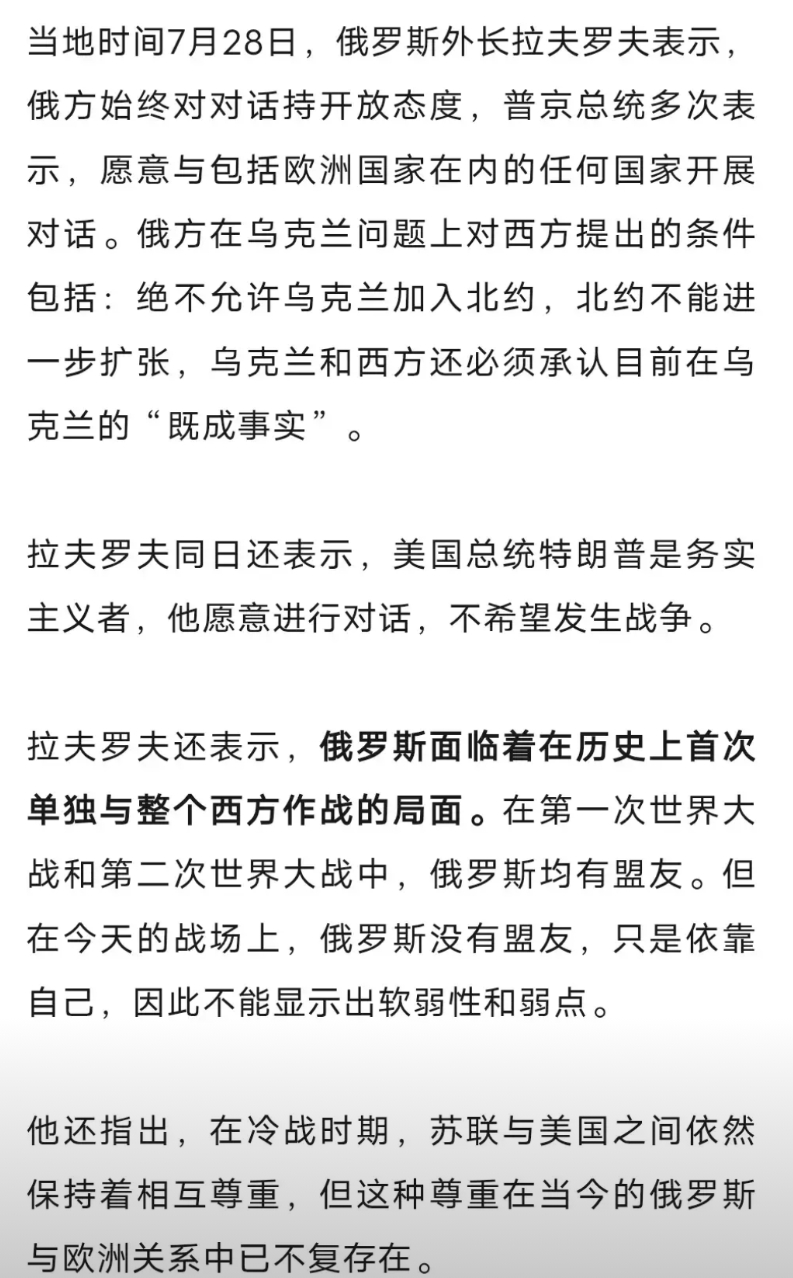 拉夫罗夫这次说错话了,如果仅仅是俄乌战争,没有国家会支持俄罗斯,如果是与整个西方作战,绝不会是俄罗斯在单打独斗,背后一定会有反西方霸权的支持者。 当地时间7月28日,拉夫罗夫对外表示:俄罗斯面临历史上首次与整个西方单独作战的局面。 如果真像拉夫罗斯说的单独作战,俄罗斯早就垮了,战争的背后是源源不断的物资支持和经济支撑,凭俄罗斯的经济能坚持三年多? 如果只是俄罗斯和乌克兰的战争,世界上是没有国家支持俄罗斯的,事实上乌克兰只是美西方的一个代理人,提线木偶,俄罗斯面临的确实是整个西方的战争。 包括印度在内的许多国家与俄罗斯保持正常的贸易关系,实质上是用另一种形式在支持俄罗斯与整个西方作战。 伊朗向俄罗斯提供了无人机,也有国家提供炮弹甚至士兵,古巴、委内瑞拉等国不谴责俄罗斯就是支持反西方霸权。 俄罗斯可以悲壮但绝不能不能悲观,与整个西方霸权的战斗绝不会是孤军奋战……