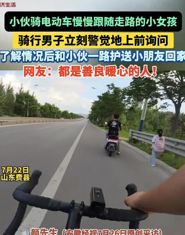 “这事儿太暖心了!”山东一男子见小伙骑电动车低速尾随独行小姑娘,心生警惕上前询问,得知小伙是担心孩子安全才默默护送,两人随后一同陪小姑娘回家,解除误会后相视一笑![微风] 那天下午五六点,正是下班放学的高峰期,男子像往常一样,骑着自行车,他瞧见前面有个小姑娘,背着个大书包,独自一人走在人行道上。 而在小姑娘身旁不远处,有个小伙骑着电动车,速度很慢,还一直跟在小姑娘身后,保持着不远不近的距离。 这一幕,一下子就让男子警觉起来了,他心里直犯嘀咕:这俩人啥关系啊?要是认识,小姑娘咋不上小伙的车? 可要是不认识,这小伙为啥一直跟着人家小姑娘,难不成想使坏?男子越想越不踏实,不行,他得去问问清楚。 这么想着,男子就加快了骑车速度,来到小伙身边,开口问道:“这小姑娘是谁,是你妹妹吗?” 小伙一听,愣了一下,赶忙解释说:“我不是她哥,我就是看她一个人走,车这么多,怕她不安全。” 男子听了,还是有点半信半疑,笑着打趣道:“我还以为你不怀好意,看你一直跟着她,谁知道你是不是坏人!” 小伙被这话弄得哭笑不得,赶忙接着说:“大哥,我真的是好心,寻思着送她回家,可这小姑娘机灵得很,不能坐陌生人的车,咋都不肯上我的车,我又怕她一个人走不安全,就只能在后面跟着了。” 原来,小姑娘的父母工作太忙,没来得及按时来接她放学,她只能自己走路回家。 小伙也是个热心肠,看到小姑娘独自走在车来车往的街道上,心里就一直惦记着她的安全,想帮她一把,可没想到被男子当成坏人了。 听了小伙的解释,男子心里虽然还是有点疑惑,但他也决定陪着一起走,多个人多份保障。 于是,这俩原本互相防备的陌生人,就这么陪着小姑娘,慢慢朝家的方向走去。 一路上,他们一边走一边聊天,男子从小伙口中得知,这小伙平时就是个热心肠。 就这么走了大概十多分钟,他们终于来到了小姑娘家所在的小区门口,小姑娘跟他们道了谢,蹦蹦跳跳地进小区了。 这时候,男子和小伙才相视一笑,这一刻,他们心里的那层防备彻底消失了,彼此都相信对方是善良的人。 这事儿在网上传开后,网友们都炸开了锅,有人说,小姑娘做得对,牢记安全知识,不随便坐陌生人的车,自我保护意识强。 小伙也没错,虽然被误会,但还是坚持护送小姑娘,这份善良难能可贵,男子警惕性高,看到不对劲就上前询问,也是在保护小姑娘。 他们俩虽然一开始互相防备,但都是出于好心,最终一起守护了小姑娘的安全。 还有网友感慨,现在社会复杂,大家出门在外,都得有点防人之心,可即便如此,大家心底的那份善良和热心肠,也并没有被磨灭。 对此大家有什么看法?