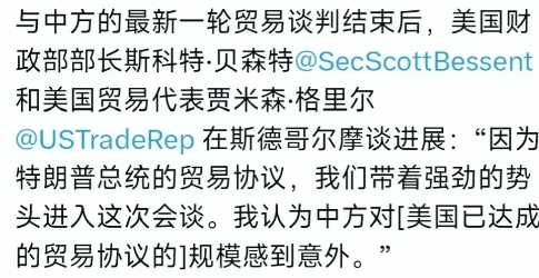 美国财政部长贝森特在斯德哥尔摩公开表示,因为特朗普的贸易协议,我们强势进入会谈,