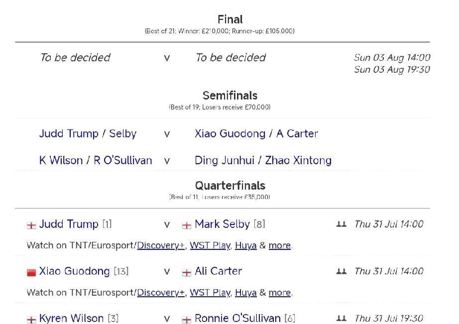 今天,2025年斯诺克上海大师赛将进行1/4决赛。下午14点,贾德·特鲁姆普对阵