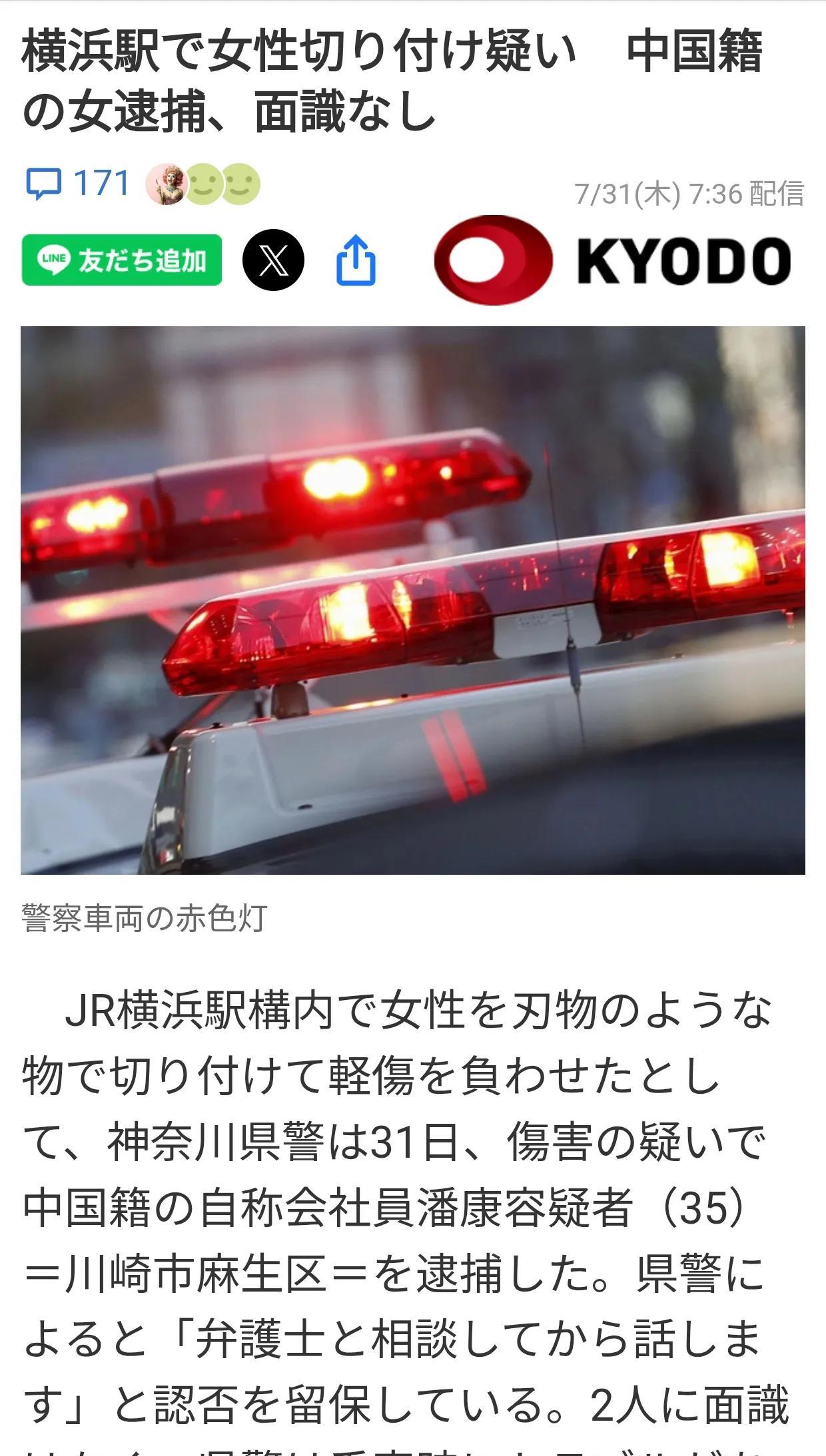 中国籍女子横滨站持刀伤人被捕 日媒报道:7月31日,神奈川县警方逮捕了居住在川崎