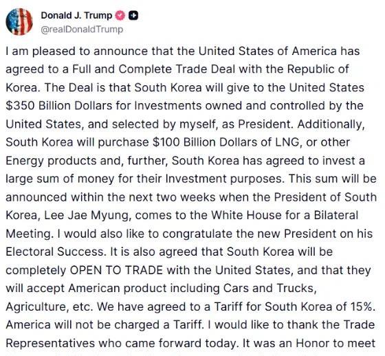 特朗普公布了和韩国方面谈判的具体成果:3500亿美元投资+1000亿美元油气合同