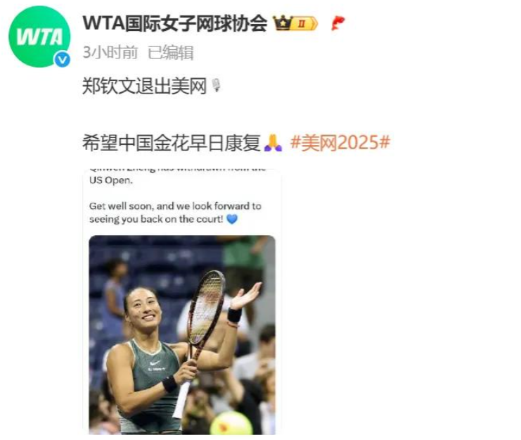 7月30日,郑钦文的体能教练Garbiel分享了一张照片,并配文,“never fails, never lies, Always delivers, Track.”(永不失败,永不欺瞒,坚持付出,保持前进)。 7月19日,郑钦文在社交媒体宣布,自己近期一直受困于右肘疼痛,昨天已经成功接受右肘手术,将伤缺一段时间。 郑钦文写道:“按下暂停键,为了更好地归来。想和关心我的朋友们分享一下我的近况:近一段时间训练和比赛期间,我一直受困于右肘疼痛。虽然我一直通过采取干预措施坚持,但疼痛的影响始终存在。” 7月22日,@WTA国际女子网球协会 微博于3时45分发布消息称,郑钦文退出美网。