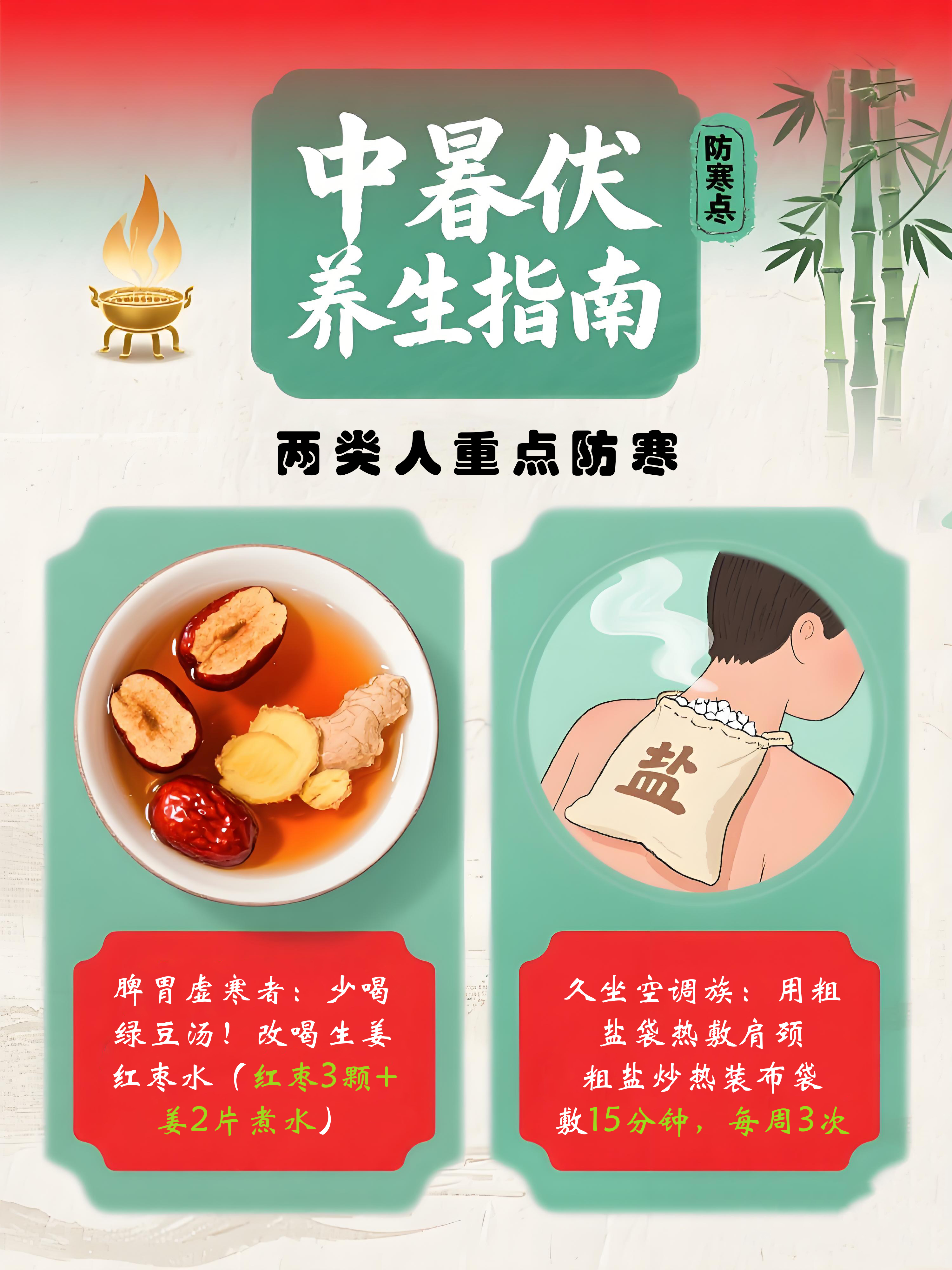 脾胃虚寒者:少喝绿豆汤!改喝生姜红枣水(红枣3颗+姜2片煮水);久坐空调族:用粗盐袋热敷肩颈(粗盐炒热装布袋,敷15分钟,每周3次)吸湿散寒。