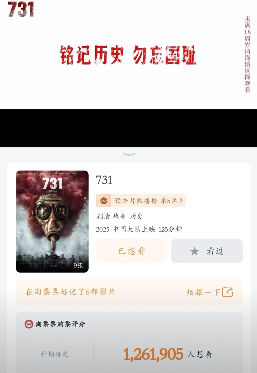 为香港点赞,7月31日香港重映老电影《黑太阳731》。现在在淘票票上预告上映的新片《731》已经没有音讯了,不知道遇到了什么阻碍?