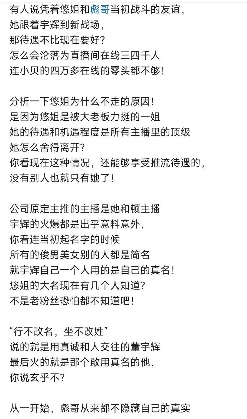 谁能想到短短一年多点的时间差距那么大! 悠悠和彪哥当初那里的一对“好搭档” 被很多喜欢他们双播的粉丝嗑成“CP” 到现在,却成了这波粉丝的“意难平”! 更因为悠姐现在的表现离同行女主播 相去甚远而越发令人唏嘘! 说起原因,有人说这不仅仅是选择的问题 还有原公司对人才的管理方式制度的问题! 其实,有很大程度上 是原来直播开始之前制定的制度有关! 公司注册了主播们的姓名权, 只是因为大家原来都是教培员工, 所以签的合同不是MCN签约待遇机制, 这种制度从好的一点来说, 工资不用考核业绩,压力小。 但从另一方面来讲, 就是主播个人能力突出来以后, 可能就没有了自己的姓名使用权。 甚至因为还是打工人身份, 导致你带动了公司火爆出圈, 但是从本质上来讲,还是一个“基层打工人” 不是合伙人,更不是什么公司高层, 只是一个名声在外,粉丝呼声很高 实际在内部,连年会门票都没有, 只有上台表演的份,更别提内场的座位了。 从现在看到的切片来看 当时如果没有二老板的牵扯, 他哪里还有机会在台上和高层合影? 哪里还有机会在台下就坐? 看看公司公告里连个完整的名字都没有 有一个很有意思的“那个人”代称! 你说,“那个人”是谁? 从始至终,公司在爆红以后 “董宇辉”这三个字在内部竟然没人敢提? 现在某选三周年公开的回顾长视频, “那个人”在整个片子里连一个镜头都没有! 这是被故意抹掉痕迹?还是被选择性遗忘? 历史是成功王朝对前朝历史的编纂! 修史谁能留名谁不能留名, 那是主修者的一言堂, 被修者哪有机会出来喊一声, “你怎么能胡编乱写?” 某选三周年,两年有董,一年没有, 而他失去了所有在明面史册中的“被纪录”! 想想,这意味着什么? 是回避,还是剥离? 忘却历史意味着背叛! 记载事件的一方, 心不平气不顺, 是不想在自己的地盘“为他人做嫁衣裳”吧! 有网友看得比较透彻(看图二) 而我的理解就是前面这些! 我一直认为自己比较第三方视野 毕竟当初学得的是新闻学! 保持应有的内核稳定 这是基本的职业素养! 还事件以本真 这是准则,是公正公平公开透明! 你说是不是?