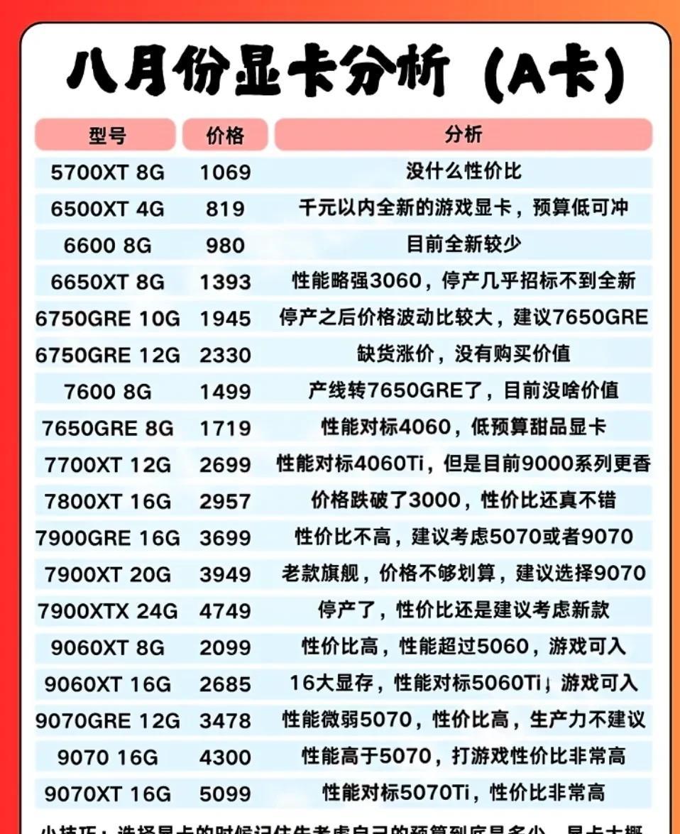 八月份显卡的分析!A卡又降价了?到底值不值得入手。 大家好,我是大海,马上进入8月了,估计还是有很多电竞爱好者想要升级一下或者更换一下自己的主机!体验一下新的游戏体验和情绪价值! 根据当下的行情分析,A卡的价格越来越低,N卡的价格也趋于稳定,经过618沉淀了一个月之后,市场走向趋于稳定!很多显卡还是很高性价比的。 据爆料老黄将推出几款新的显卡,不知道价格如何!电脑这个东西显卡预算的占比还是占大头的,想要均衡搭配就要结合自己的用途去分析一下! #头号创作者激励计划#