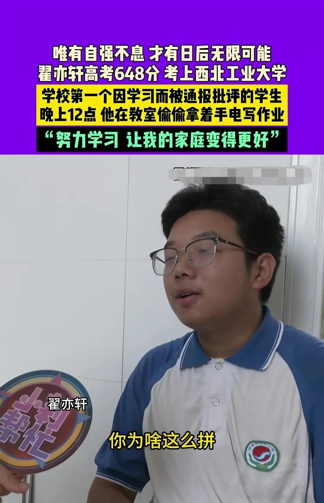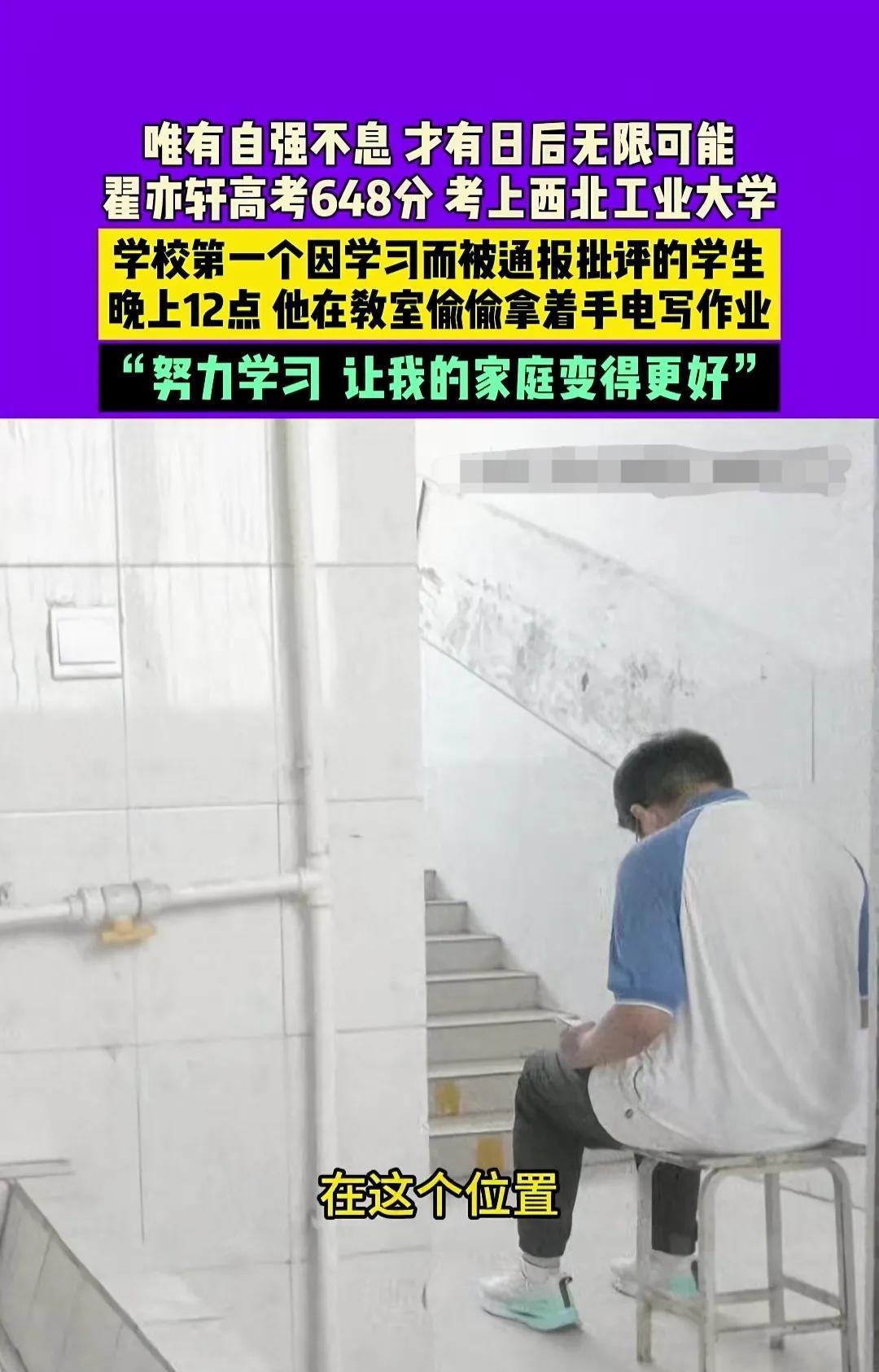 学习资料比2个人还高!河南周口,18岁乡村男孩考上了西北工业大学。然而,他是第一个因学习被通报批评的学生。 来源:小莉帮忙 他叫翟亦轩,出生在一个农民家庭,家中兄妹4人,去年父亲患病做手术后,家中靠母亲打零工生活。 他自小学习勤奋,希望通过学习改变命运。 一天晚上过了12点,保安发现熄灯的教室竟有微弱的光,保安吓了一跳,悄悄来到教室,扒在窗户上一看,竟是翟亦轩手握手电在学习。 保安赶紧让他回宿舍。 学校知道后,对他进行了通报批评,他大概是因为学习被通报的第一人。 经过通报,他还是继续刻苦学习,只是转移地方了,为了不影响宿舍同学的休息,他在洗漱室门口,搬个板凳学习到深夜。 在他看来,父母的辛苦,家中兄妹又多,只有好好读书。 他说:我想拼尽全力,改变我的家庭! 高三期间,他每天学习超过14个小时,早上5点半准时起床晨读,在他所有的学科中,英语是弱项。 他就认真听讲,认真记笔记,有不懂马上去问老师,拿出他的英语笔记,整齐、知识点清晰明了,英语老师说起他连连点赞。 他会坚持当天的问题当天解决,他的执着和持之以恒,终有所获。 他的高考英语成绩127分。 功夫不负有心人,他的高考成绩以648分被西北工业大学航天学院录取。 走进他家,家徒四壁,可他的学习资料摞得有2个人高,这还只是一部分。 视频在网上传开后,网友们祝福声音一片。 有人说:知识改变命运,学习改变人生,以后会越来越好! 这个被通报批评,竟是因为深夜打着手电筒学习! 他说:努力学习让我的家庭变得更好,这句话没有大道理,只是一句大实话。 能坚持下来,这就值得所有掌声! 真正的光,从来不是别人给的,是自己去争取! 大学只是人生的一个新起点,未来的考验会更多。 祝福翟亦轩学业有成! 你觉得呢?