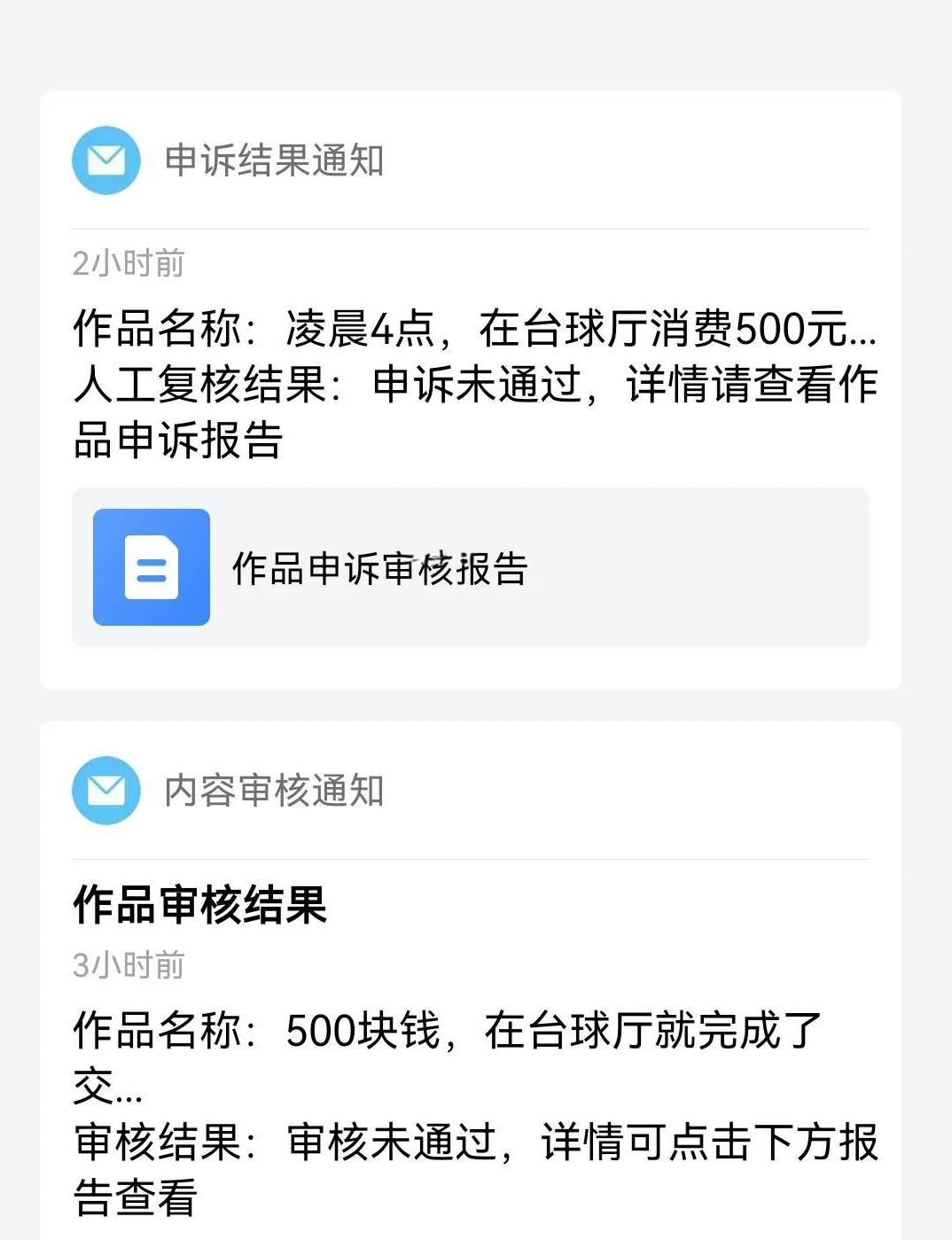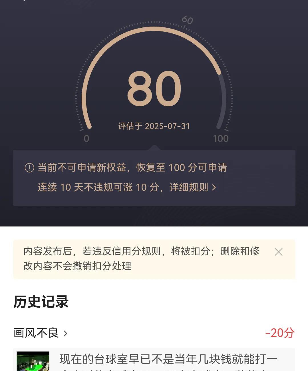 写了一篇500块钱的台球厅事件,结果羊肉没吃到,反惹一身骚。 打开一看,最显眼的是一条系统消息,作品审核未通过,说作品宣扬低俗色情。 既然审核未通过,那我就修改一下。没想到,还是没通过,等我申诉后,结果就是直接扣了信用分20分。 真是服了。 平台上那么多人写这个事件,也没违规,怎么,我一写,就违规呢? 而且,我写的都很含蓄,表达的也不直白,就被扣分了。 真是搞不懂。