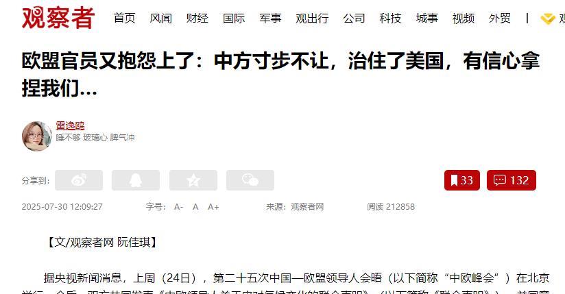 欧盟终于意识到,治住美国的中国,拿捏自己并不是什么难事! 一名欧盟官员透露,上周举行的中欧峰会虽然总体上没有出现什么波澜,但在一些涉及到重点关切的议题上,欧盟方面发现中方如今拒绝让步,在谈判中展现出了“更多的自信和底气”。 虽然这名欧盟官员没有明说,但估计这里指的“重点关切的议题”,应该就包括中欧之间的电动车谈判和稀土问题。 今年4月特朗普嚷嚷着要搞“对等关税”,本想给中欧两边都添点堵,没想到中欧很快坐下来谈,打算用设置最低价格的方式,替代欧盟原本要加征的关税。 当时不少分析都觉得,中国肯定要在7月中欧峰会前搞定,毕竟以往都是中国有求于欧盟的市场,因此谈判时欧盟总是端着架子。 然而这次中欧峰会中,面对欧盟趁机提出来的“技术转移”等额外要求,中方压根没接茬,从头到尾就守着最初的立场,一点松动的意思都没有。 会后就有欧盟高级官员告诉记者,中方寸步不让,我们本以为他们至少会作出一些表面上的让步,结果完全没有。 中国为何敢置欧盟不理?就是因为中国电动车产业,早就不是当年需要靠技术换市场的阶段了。 全球最大的电动车市场在中国,最完整的产业链也在中国,欧盟要是真撕破脸加征关税,受损的恐怕不只是中国企业,欧洲本土的汽车经销商、零部件厂商都会跟着遭殃。 除了电动汽车,最让欧盟官员头疼的是稀土问题,虽然电动汽车问题中方没有松口,但是至少是中欧两方都需要彼此,还有谈判空间,可是稀土完全就是中方在拿捏。 中国实施进出口管控后,欧盟那边抱怨声就没断过,天天喊着让中方放宽政策。但中方的态度很明确:管控措施不会变,想进口就得按正常流程来审批。 这可不是故意刁难,稀土作为战略资源,任何国家都会审慎对待,中国只是在履行正常的资源管理职责。 欧盟急成这样,恰恰说明他们在高端制造领域,离不开中国的稀土供应,过去那种想拿点好处就伸手、从不考虑对方利益的日子,显然是过不下去了。 另一名欧盟官员则直言,中方已经转变策略。他们确信自己治住了美国,也更有信心拿捏我们。这倒不是官员在吹嘘中国,是事实就是如此 特朗普一会儿说要对中国商品加税,一会儿又放风说愿意谈判,无非是想营造“中方有求于美”的假象,好抬高自己的谈判筹码。 可中方根本不吃这一套,该争取的利益寸步不让,该坚守的底线毫不动摇,最后只能是美国自己找台阶下。 这种应对方式,欧盟看在眼里,心里不可能没想法,连美国都在中国这里讨不到便宜,自己那些所谓的“优势”又能撑多久? 其实欧盟心里清楚,现在的中国早已不是他们印象中,那个需要看别人脸色的国家了。 中国有超大规模的市场和全产业链优势,在新能源、5G等领域已经走到了世界前列,国际话语权上,越来越多的国家愿意倾听中国声音。 这种综合实力的提升,让中国在谈判中既有坚守立场的底气,也有灵活应对的空间。 说到底,欧盟感到不适应,是因为过去那种西方主导的国际秩序正在发生变化。中国从来没想过要“拿捏”谁,只是在国际交往中坚持平等互利的原则,不再接受不合理的要求。 如果欧盟能早点认清这一点,放下过去的优越感,用平等的姿态和中国打交道,很多问题其实都好解决。
