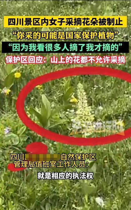 “必须严惩!”7月29日,四川阿坝州,一女子在景区内突然停车,跑到草地中采摘花朵,工作人员发现后立即赶来阻止,告诉女子这些都是国家保护植物!女子则辩解道:“我看到很多人摘才摘的。”网友:建议加大惩罚力度! 对于保护动物,想必大家都有所了解,但很多植物其实也是受保护的,而且植物分辨起来更加有难度,有时路边的“杂草”都可能是保护植物,更别说景区里面的了。 这天,女子开车来到景点游玩,沿途她看到了许多奇异的花草,于是突发想象,打算采摘一些捆成花束,等会拿着拍照还能好看些。 于是女子就将车子停在路边,跑到草里地挑选好看的花草采摘。不一会儿,巡逻的工作人员发现了女子,急忙制止了她的违法行为! 要知道,这里可是自然保护区,很多动植物都是受保护的,因此景区内明令禁止采摘花草,可女子却毫不在乎,依然对可爱的花草痛下杀手。 不过,景区工作人员并没有执法权,对于女子的行为只能劝导。有网友就提出建议,直接加大惩罚力度就可以了,罚到她们不敢采摘! 确实,老师从小就教育我们不要践踏草地、不要采摘花朵,可有些人却还是没有素质,见到好看的花就想摘下来带回家。 大家对于这件事是怎么看? 信息来源:《女子采摘路边野花被制止称是国家二级保护植物,工作人员表示:保护区内植物不允许采摘,我们没有执法权,只能让工作人员劝阻》羊城派