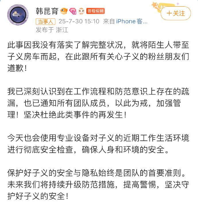 孟子义经纪人私带陌生人进房车引争议:隐私边界与行业规范再受拷问 “孟子义经纪人道歉”的词条突然冲上热搜,让不少网友一头雾水。事件的核心并不复杂:孟子义的经纪人在艺人本人毫不知情的情况下,将一名陌生人带入其专属房车,对方还拍摄了大量车内照片。这串看似简单的事实组合在一起,却折射出娱乐圈隐私保护的漏洞与行业规则的模糊地带,也难怪网友会发出“剧组有人脉也不能这样”的质疑。 艺人的房车,看似是工作场所的延伸,实则承载着私人空间的属性。对孟子义而言,这里或许是她在密集拍摄间隙短暂休憩的角落,是存放个人物品、卸下公众形象的“安全区”。经纪人作为与艺人关系密切的工作伙伴,理应最清楚这份“私人领域”的边界,却在未告知的情况下让陌生人进入并拍摄,这种行为不仅是对艺人个人隐私的漠视,更违背了职业伦理中最基本的信任原则。 更值得玩味的是“陌生人”与“人脉”的关联。网友的愤怒,很大程度上源于对“特权越界”的敏感——如果因为所谓的“剧组人脉”,就能轻易闯入他人的私人空间,甚至将其作为“展示品”拍摄传播,那背后暴露的可能是行业内长期存在的“规则弹性”:当人情关系凌驾于隐私与规则之上,普通人的边界感尚且需要捍卫,更何况身处聚光灯下、隐私本就脆弱的艺人? 经纪人的道歉或许是事件的暂时收尾,但由此引发的讨论不应止步。它提醒着每一个身处职场关系中的人:尊重边界不是选择题,而是必修课。无论是艺人与经纪人,还是职场中的任何合作关系,守住对他人隐私的敬畏、守住职业行为的底线,才是长久信任的基石。而对于整个行业而言,也该借此反思:所谓的“人脉”与“便利”,永远不该成为践踏规则的通行证。