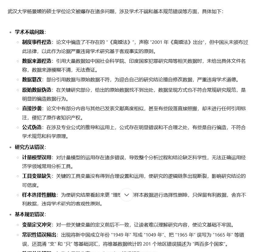 这种论文平如何能保研?杨景媛这论文问题就俩字:太离谱。 你想啊,写论文最基本的就是得内容靠谱吧? 可她倒好,居然学会了“虚构”,连国家有没有《离婚法》都能编,这就好比写篇关于手机的文章,硬说 “2020 年出了个《手机法》”,纯属瞎编。 数据更是没谱,要么没来源,要么改得面目全非,甚至自己瞎造数据,这就像做题时为了凑答案,硬改题目里的数字,一点规矩都不讲。 更过分的是抄别人的东西还不吭声,等于拿别人的作业当自己的交,这在上学时都是要挨批的,更别说学术研究了。 连新中国成立年份都能写成 “1049 年”,这不是马虎,是根本没把学术当回事,就像写作文把 “中国” 写成 “中园”,还到处是病句,看着就像糊弄事儿。 这种水平如何考入了武大? 武大真是什么人都有,可真是什么人能保研?