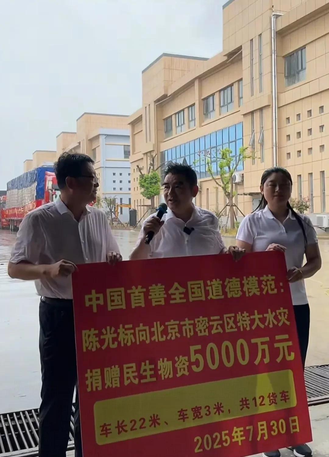 陈光标向首都北京密云灾区捐赠5000万元的民生物资,分12辆大货车(车长22米、宽3米),每辆大货车装的民生物资价值达400多万元,可想而知里面的都是品质比较好的、值钱的物资。 陈光标这次捐赠还弄了个仪式,他全程开直播给广大网友看,红会领导都来了,红会的人送给陈光标一面锦旗和证书。 其实陈光标做慈善向来都是公开,光明正大的,所以这次干脆开着直播,他是想宣传正能量,带动公益慈善,例如7月31号下午的这场直播,陈光标直接说了,希望北京当地的企业家们也一起加入到捐赠中来。 不过令人遗憾的是,还有人举报陈光标的直播间,直播时短暂的被中断,好在很快就恢复了过来。 对于那些举报者,我是真想不明白,你自己不捐也就算了,别人捐赠物资碍着你什么事了?如果你觉得他这样太高调了你不喜欢的话,那你别看不就行了。没必要举报这样坚持做慈善的企业家,他前前后后捐了多少钱知道吗?我只能说很多很多钱。 国家任何一个地方有灾情,基本上标哥都会伸出援手,而且每次捐的钱或者物资都不少,他光是捐款相关的荣誉证书都达到4000多本了,这样的大善人是企业家中的楷模,比那些赚了很多钱然后移民到外国的企业家不知强多少倍。像那个潘某某夫妇在国内赚了那么多,结果国内灾情捐款的时候看不到他们,他们去到老美,给老美学校捐钱,标哥和这种企业家一对比,不知强多少倍!所以他开直播做慈善,真没必要举报,不喜欢就划走呗。 一方有难,八方支援!这是中华民族传统美德,陈光标这次又带了个好头。