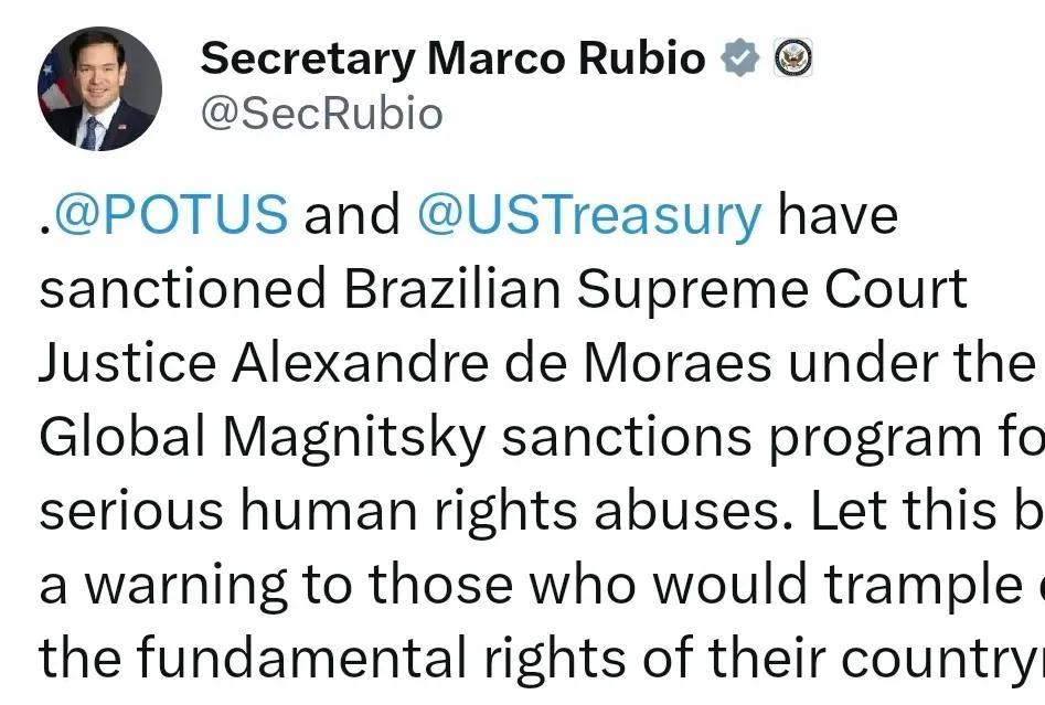7月31日,鲁比奥发文:“特朗普、美财政部已根据‘全球马格尼茨基制裁计划’,对巴