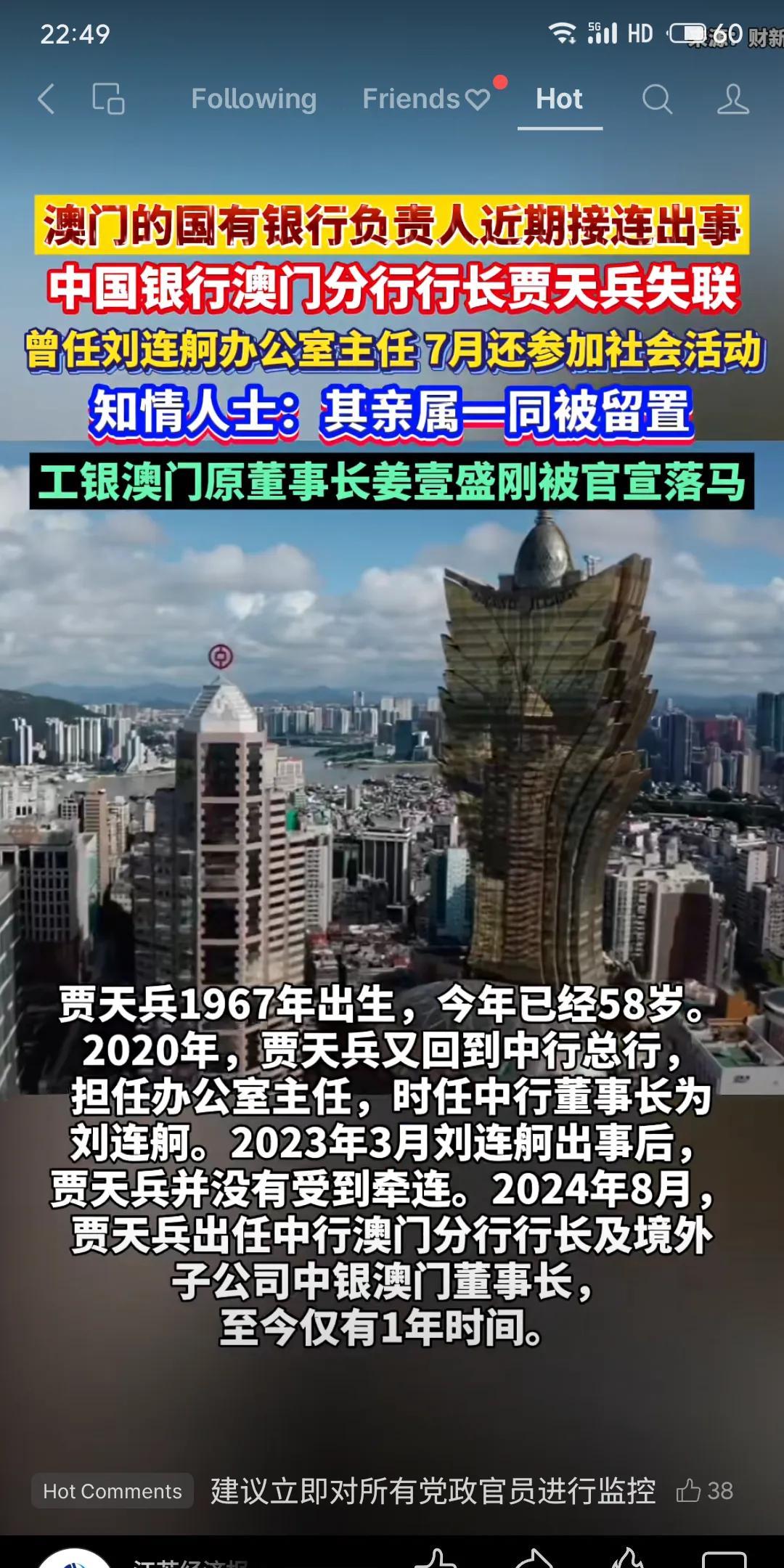 澳门中资银行高管连环落马:中国银行澳门分行行长贾天兵(曾任刘连舸办公室主任)7月