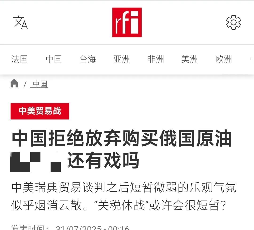法国国际广播电台今天(7月31日)写道:“中国拒绝放弃购买俄国原油,中美峰会还有