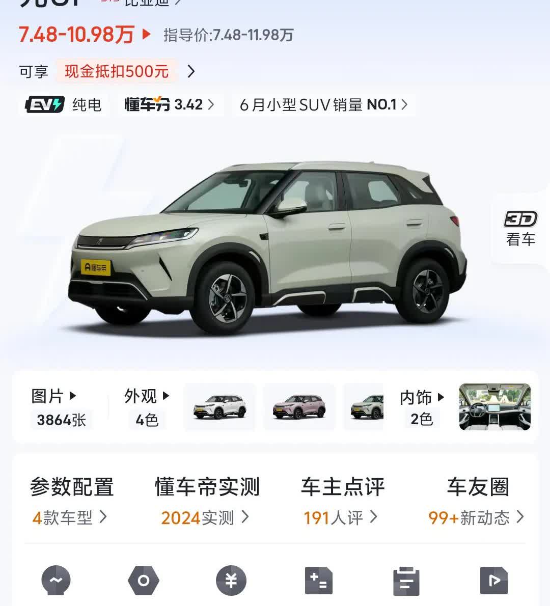 新车劲爆价!7.48万元比亚迪SUV元up[灵光一闪]。 遥想去年我家那辆花了裸车10.98万元一分钱不便宜。也只多了100公里续航和更大马力。 我家那辆的缺点是: 车机卡顿,后门关不紧,底盘调教一般般,毕竟是非独立悬挂。前轮吃胎,3万公里就得换一条轮胎。 优点是: 性价比高,续航如果定速巡航90公里,我跑过90%的达成率,非常扎实。 比亚迪元up是比亚迪10万内空间最大的suv,实际里面头部空间比元plus还大。 最重要的优点是销量高,配件好买且便宜,而且出行非常省电省钱。 关键是老品牌大厂,不怕倒闭。