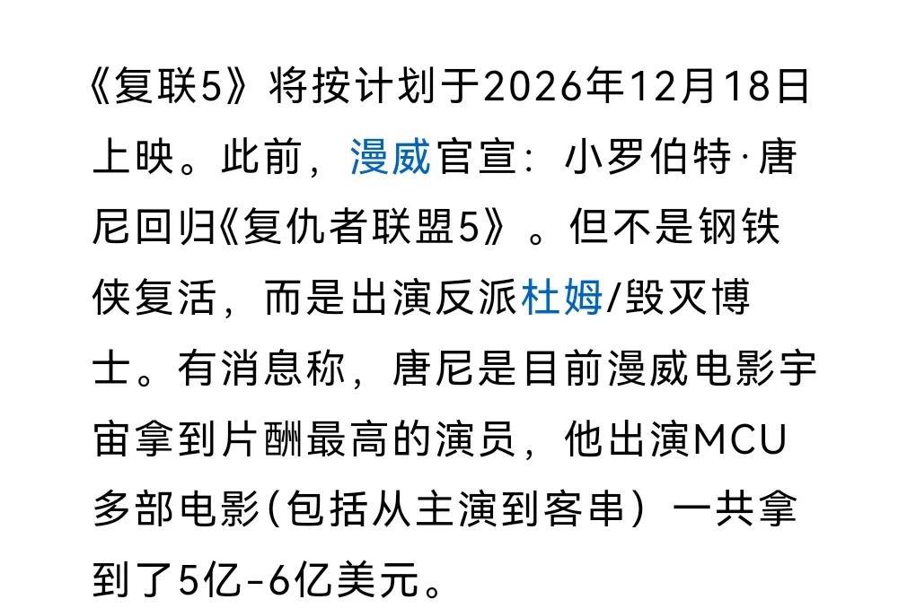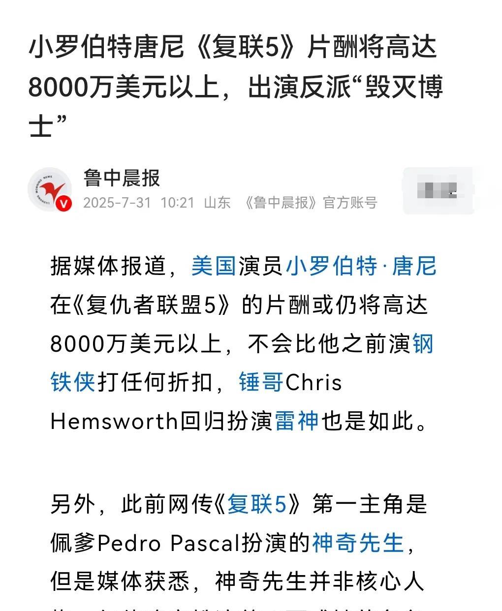 美国人还是太有钱了,拍电影都给的起价,知名演员拍部电影都能得到几千万美金。 7月31日媒体报道,小罗伯特·唐尼《复联5》片酬曝光,或高达8000万美元以上。 如果换成人民币,那是好几个亿。 这也太疯狂了。 扮演雷神的那位演员片酬也有这么高。 不得不说,漫威太有钱了。