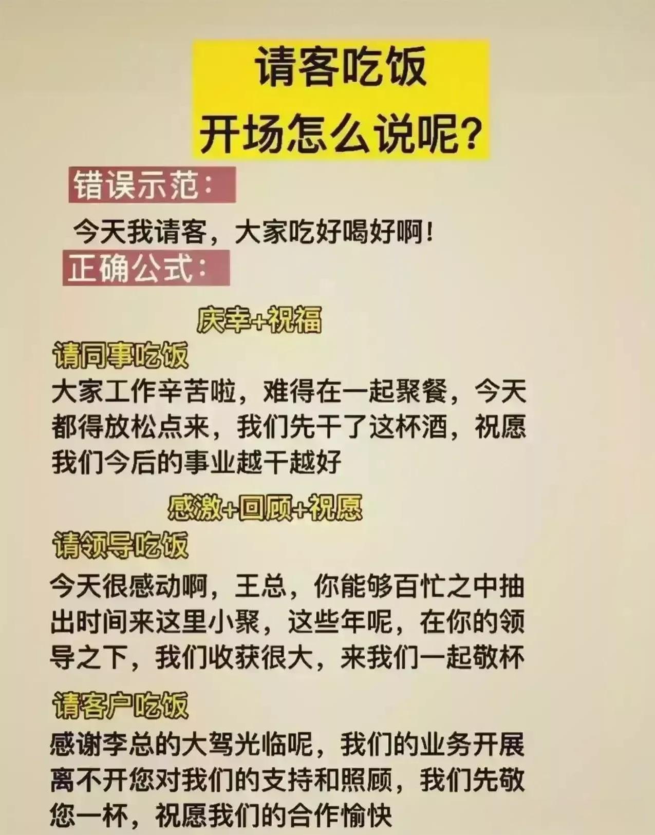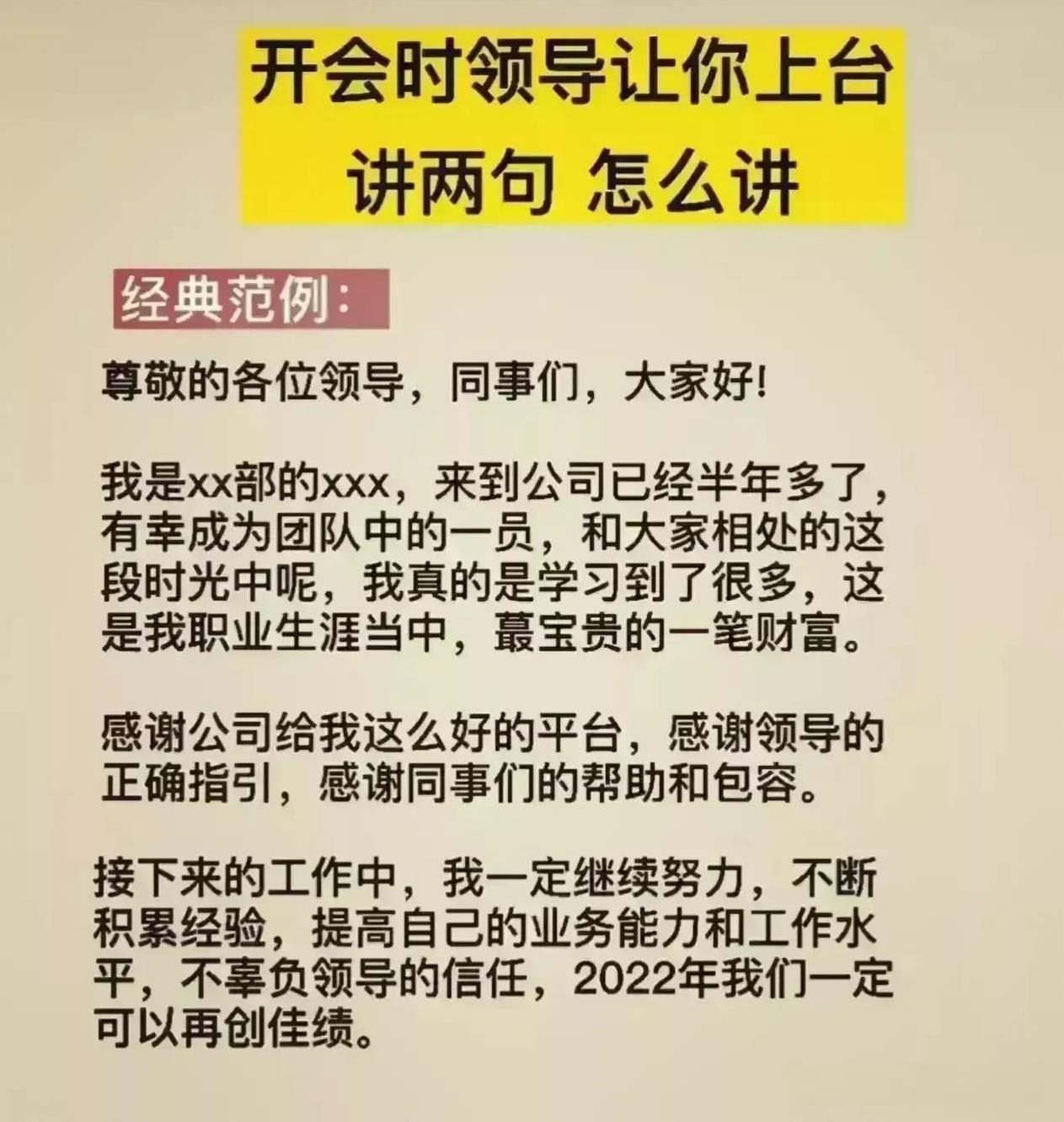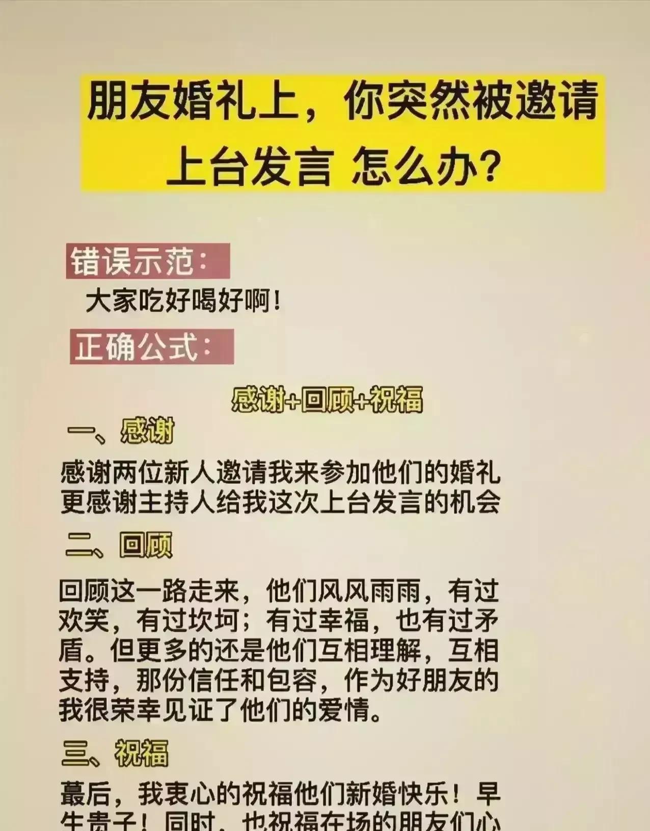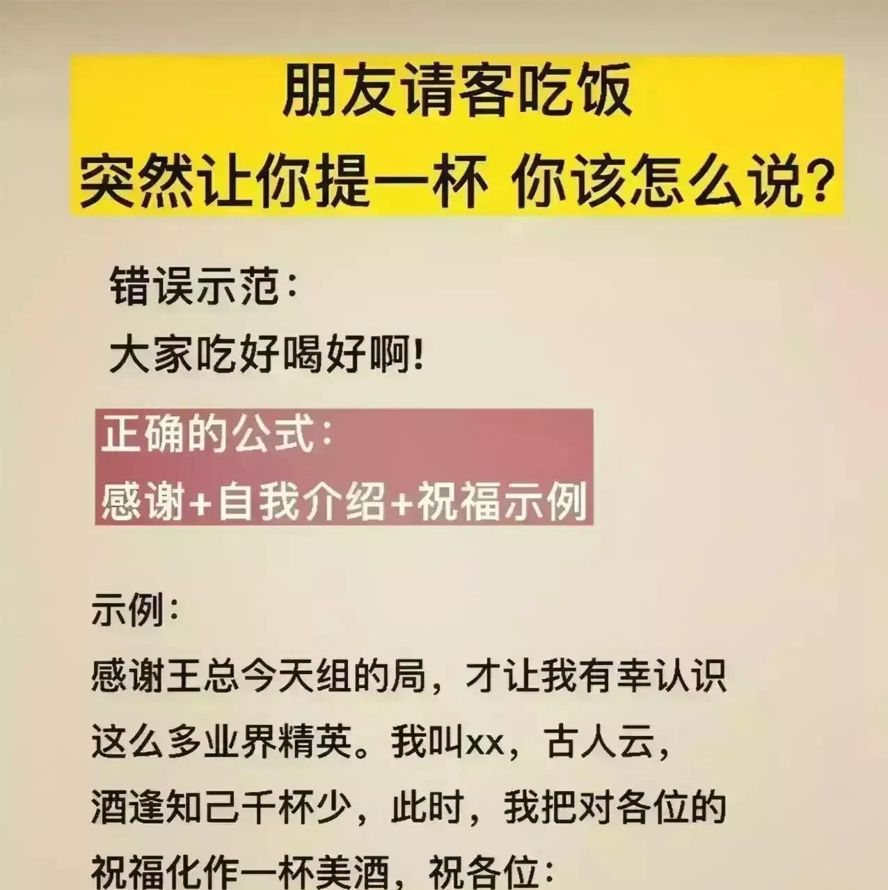 快五十岁了才弄明白,经常上台演讲的高手,早就把这些即兴演讲的万能公式倒背如流了,包括众人前讲话的开场金句、家长会家长致辞、开会员工发言、领导让上台讲话、饭局敬酒、请客开场、升学宴父母致辞、朋友饭局提酒及婚礼发言等,涵盖感谢、回顾、祝福等要素,兼顾不同对象与场景特点。看完之后,真是后悔没早点看到,不然也不会在职场吃大亏! 很多人在面对公开讲话或特殊场合发言时会感到紧张和不知所措,这些内容能够为他们提供清晰的思路和参考模板,帮助他们快速组织语言,应对各种场景。 比如在家长会上,家长代表的致辞注重对老师和其他家长的感谢,以及对孩子的期望;在饭局敬酒时,根据不同的敬酒对象采用不同的表达方式,体现了对对方的尊重和恰当的社交礼仪。 在运用这些发言致辞的公式和话术时,我们可以进一步提升发言的质量和效果。比如,在表达感谢时,可以结合具体的事例,让感谢更加真诚和具体;在回顾过去时,加入一些生动的细节,使内容更具感染力;在送上祝福时,根据对象的特点和需求,定制个性化的祝福话语。 除了掌握这些话术,还需要注重提升自身的表达能力和临场应变能力。可以通过多阅读优秀的演讲和致辞范例,学习他人的表达技巧和逻辑结构;也可以通过模拟不同场景进行练习,提高自己在实际场合中的表现。同时,要学会倾听和观察,根据现场的氛围和他人的反应及时调整自己的发言内容和方式,使发言更加自然、流畅和恰当! 看完这些即兴演讲公式,真是一清二楚,一目了然,迅速掌握人际社交核心,无论是职场新人,还是缺乏自信的老手,这份即兴演讲公式技巧都会为你的人际沟通助力,即兴演讲抓住沟通瞬间开口表达,别输在不会表达上!没事保存收藏起来慢慢看慢慢理解慢慢练习慢慢领悟,记不住也不要紧,回家慢慢学,将这些公式背熟,升职加薪少不了你! 即兴演讲 抓住沟通瞬间开口表达 别输在不会表达上